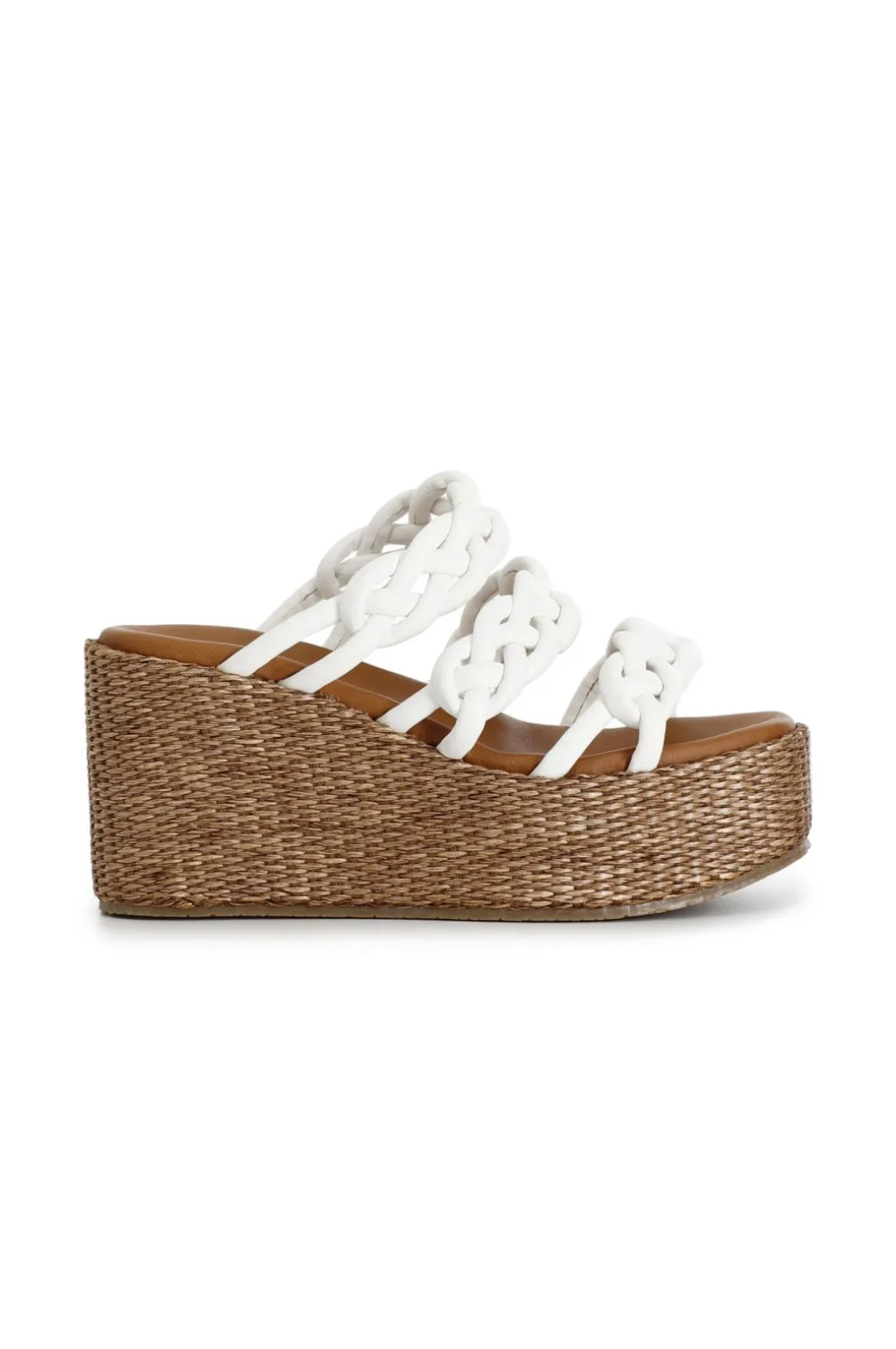 Ciabatta con tre fasce motivo intreccio. zeppa fasciata in rafia.