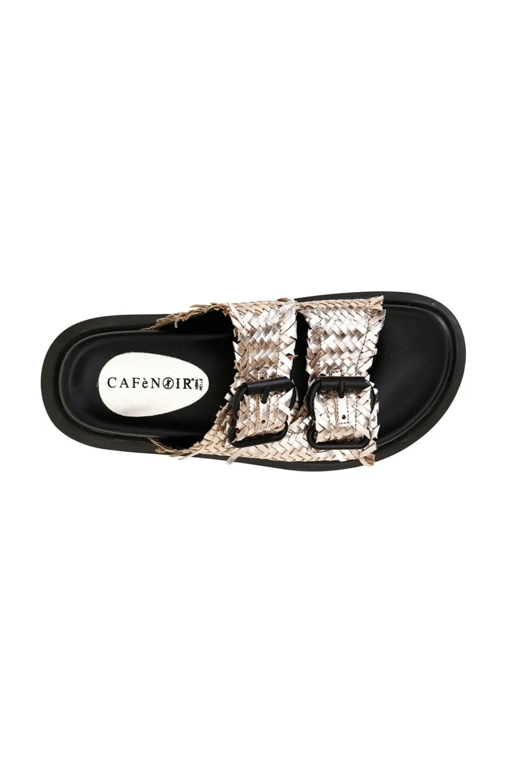 Ciabatte con doppia fibbia in pelle intrecciata dai bordi leggermente sfrangiati. Comodo footbed e suola alta in micro.
