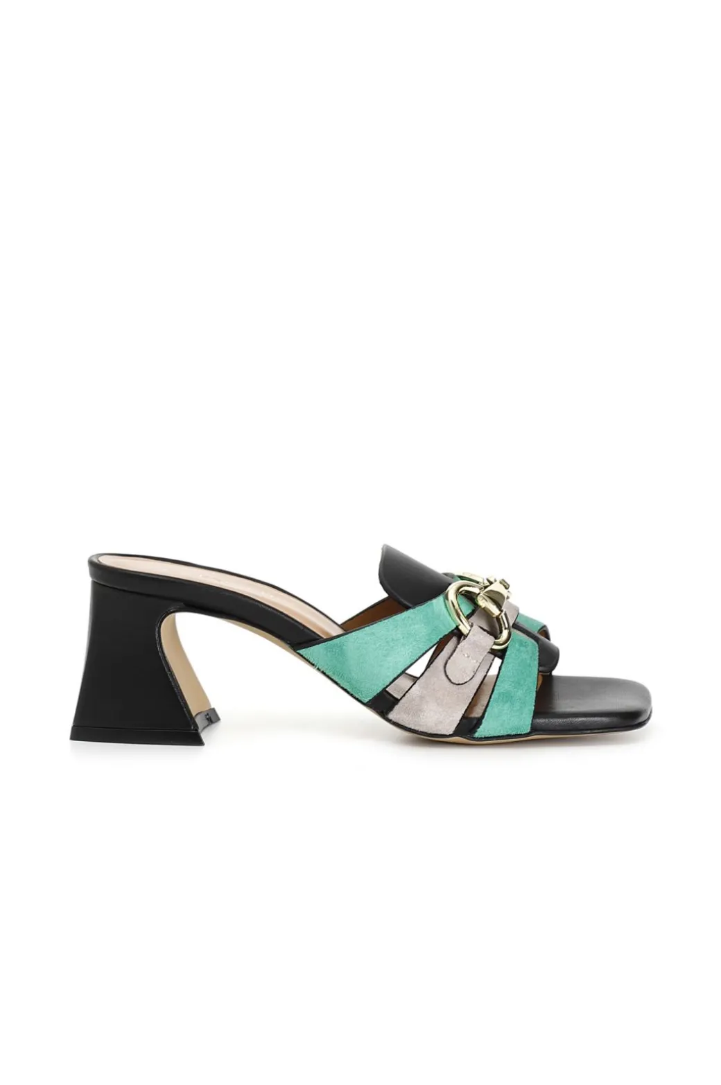 Ciabatte in pelle e pelle scamosciata bicolor con morsetto. tacco h. 70mm