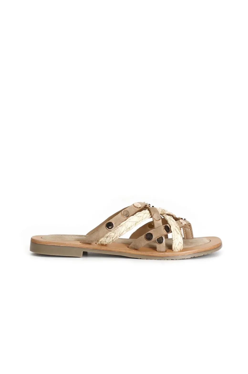 Sandali bassi modello ciabatta realizzati in pelle scamosciata e rafia intrecciata