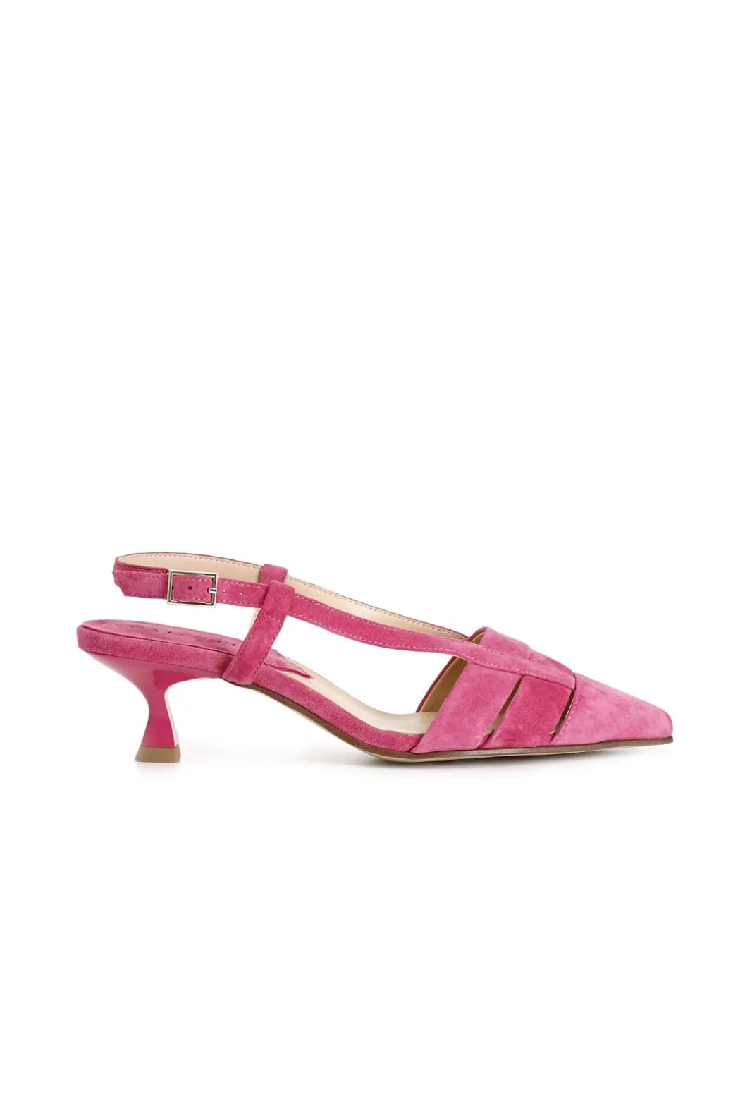 Décolleté con laccio dietro in pelle scamosciata. particolare la tomaia a fasce. forma sfilata. tacco a rocchetto alto 45mm. calzatura alla moda ma indossabile anche nel quotidiano per soddisfare le esigenze di uno stile di vita dinamico.