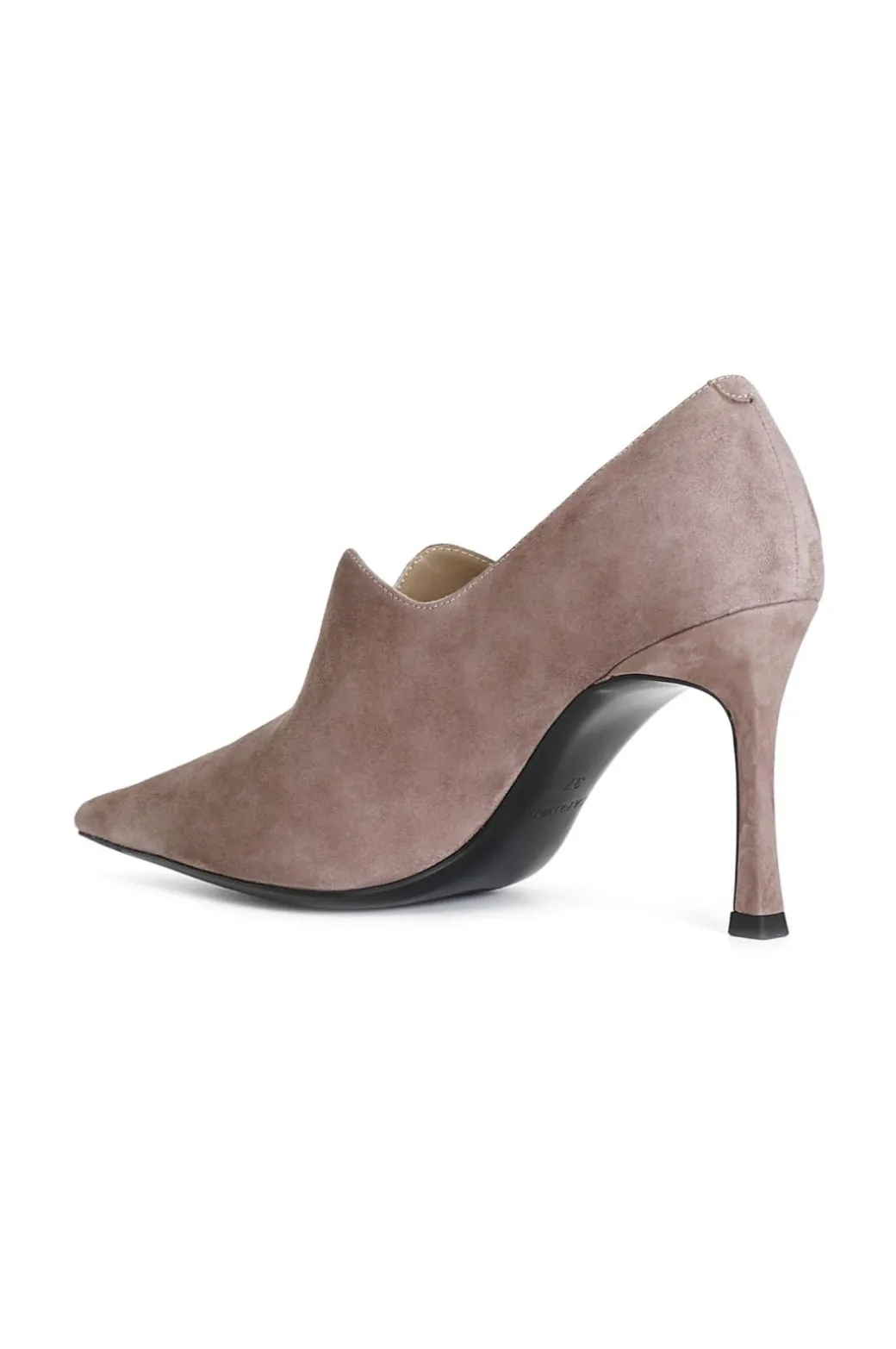 Décolleté in camoscio con taglio a “v”. tacco fine alto 87 mm. forma sfilata. fodera e soletto sono in pelle. calzatura dallo stile elegante e femminile.