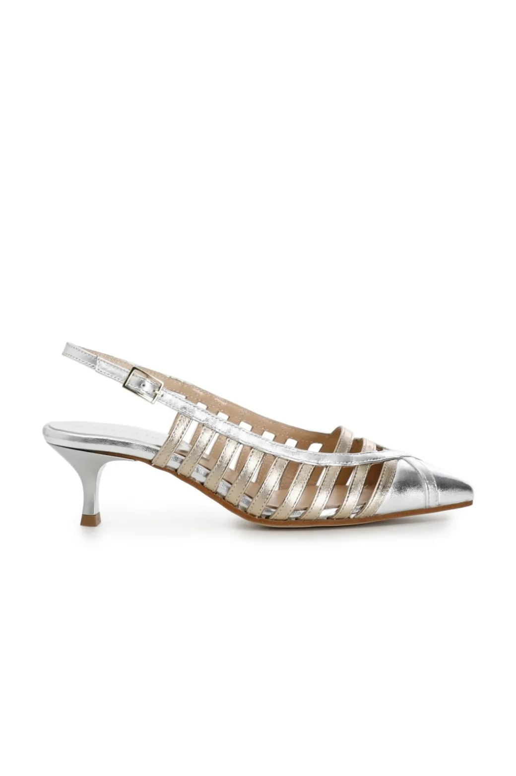 Dècollète in pelle laminata con un gioco di fasce laterali realizzate con una sfumature di colore più scuro ma in tono. Fibbia sul retro e tacchetto medio.