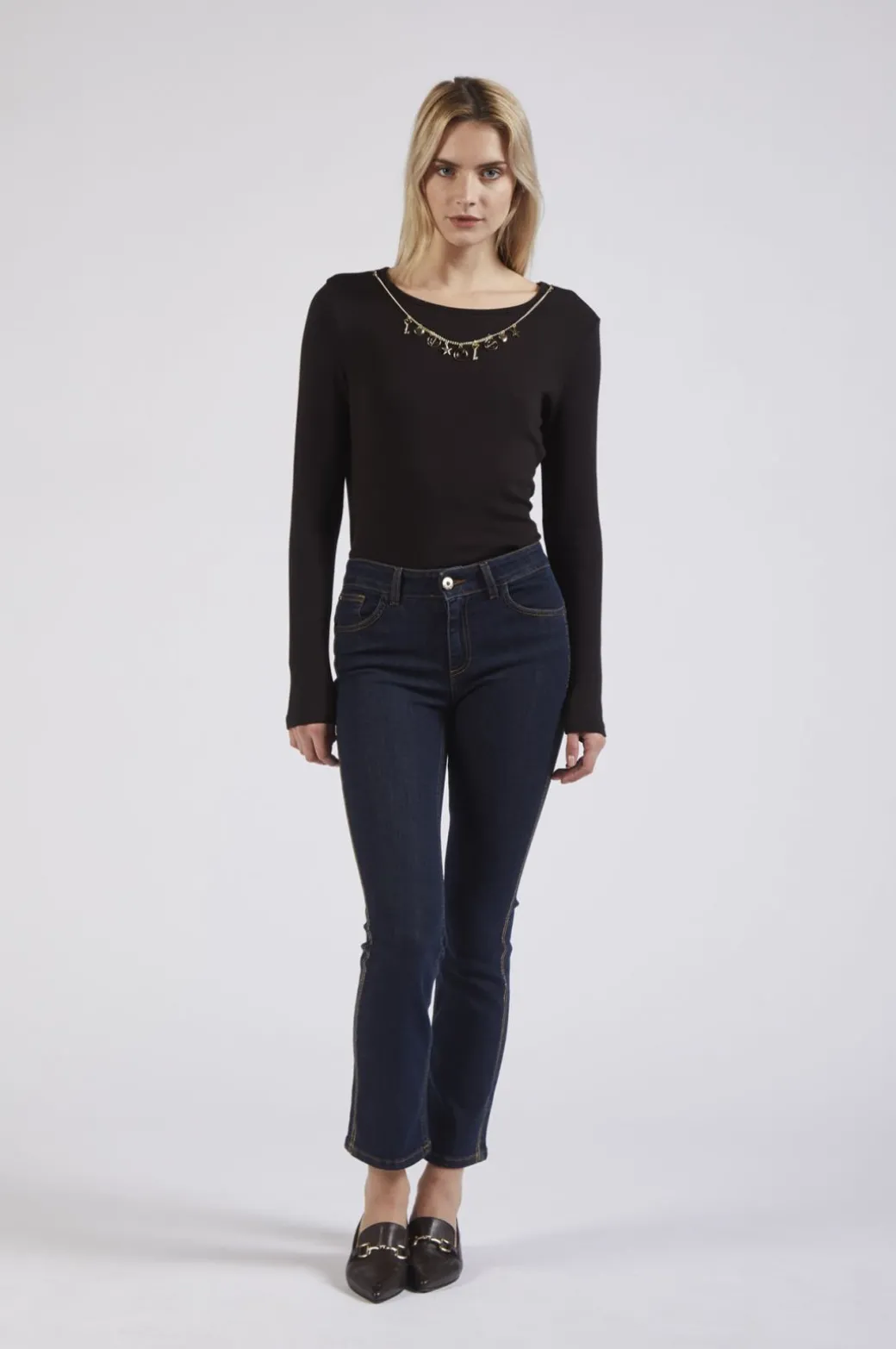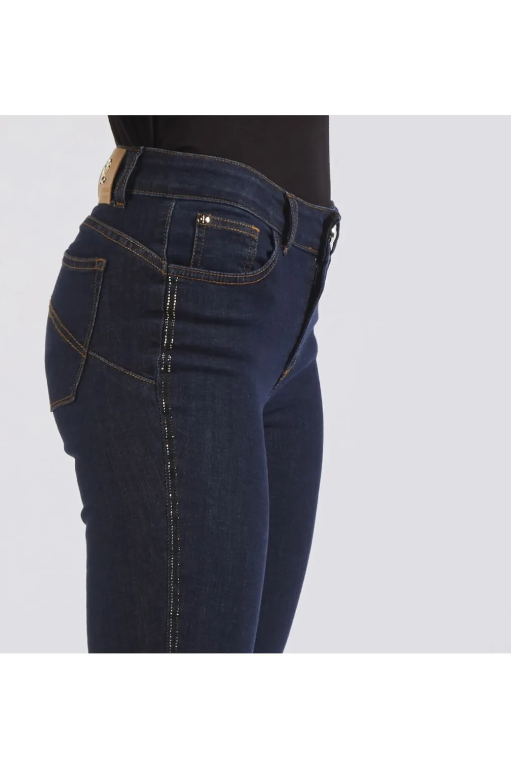 Jeans in tela denim super stretch dallavestibilità slim. applicazione di strass color ambra ai fianchi.