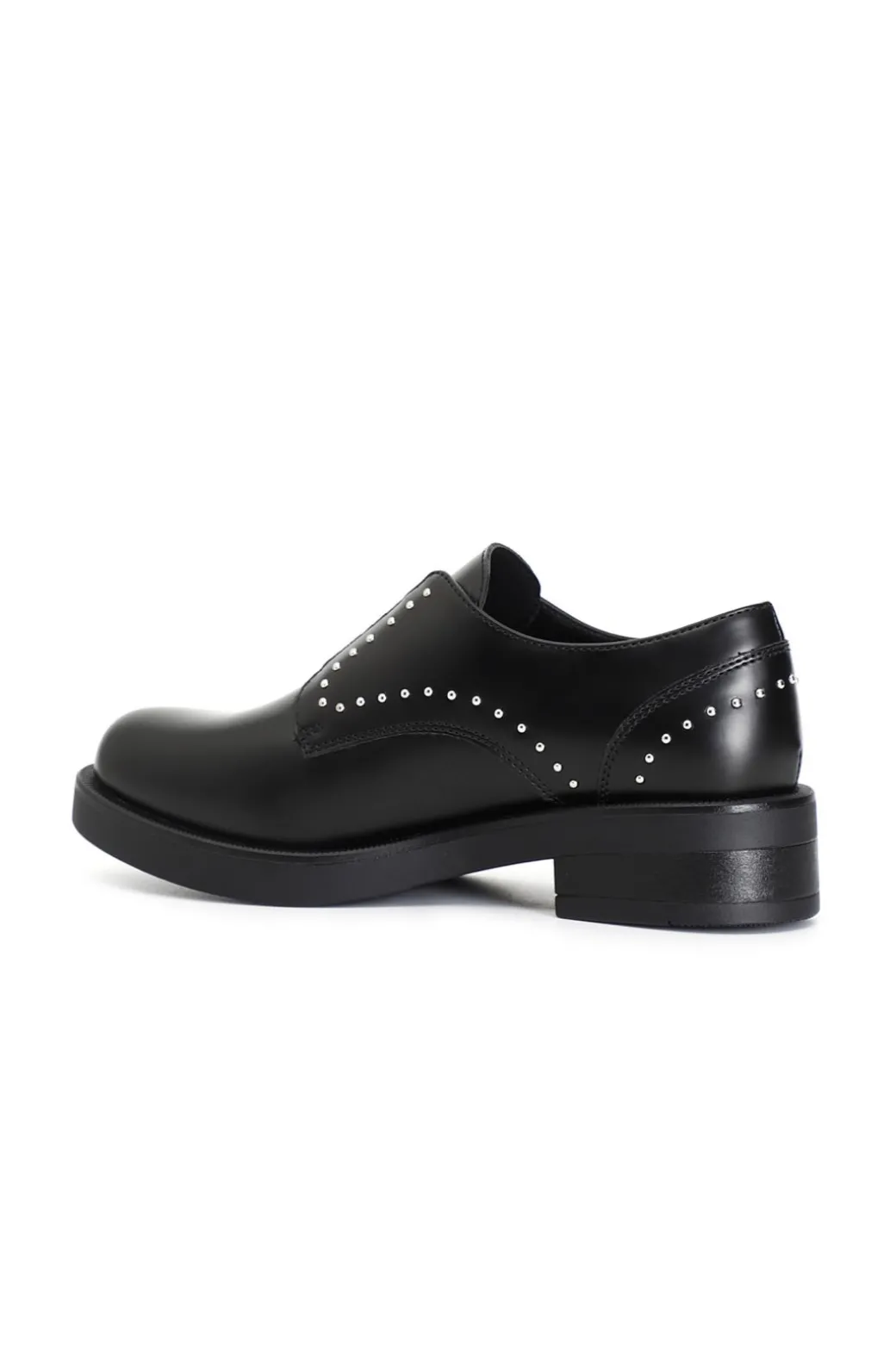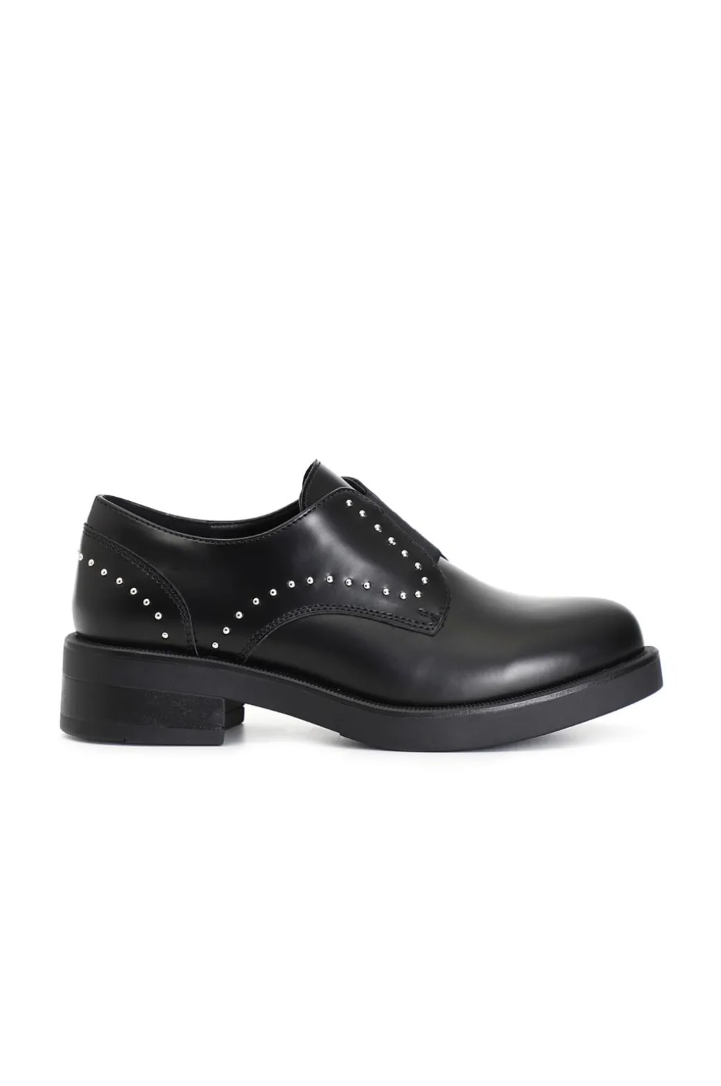 Scarpa derby da donna in similpelle spazzolata con elastico e con microborchie cromate. il soletto è in pelle.