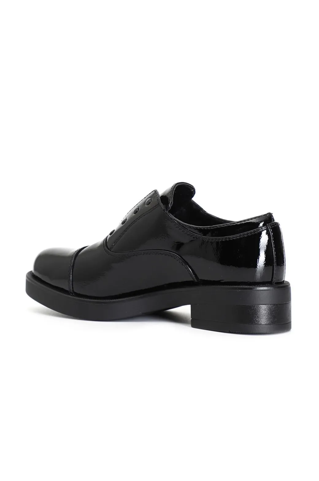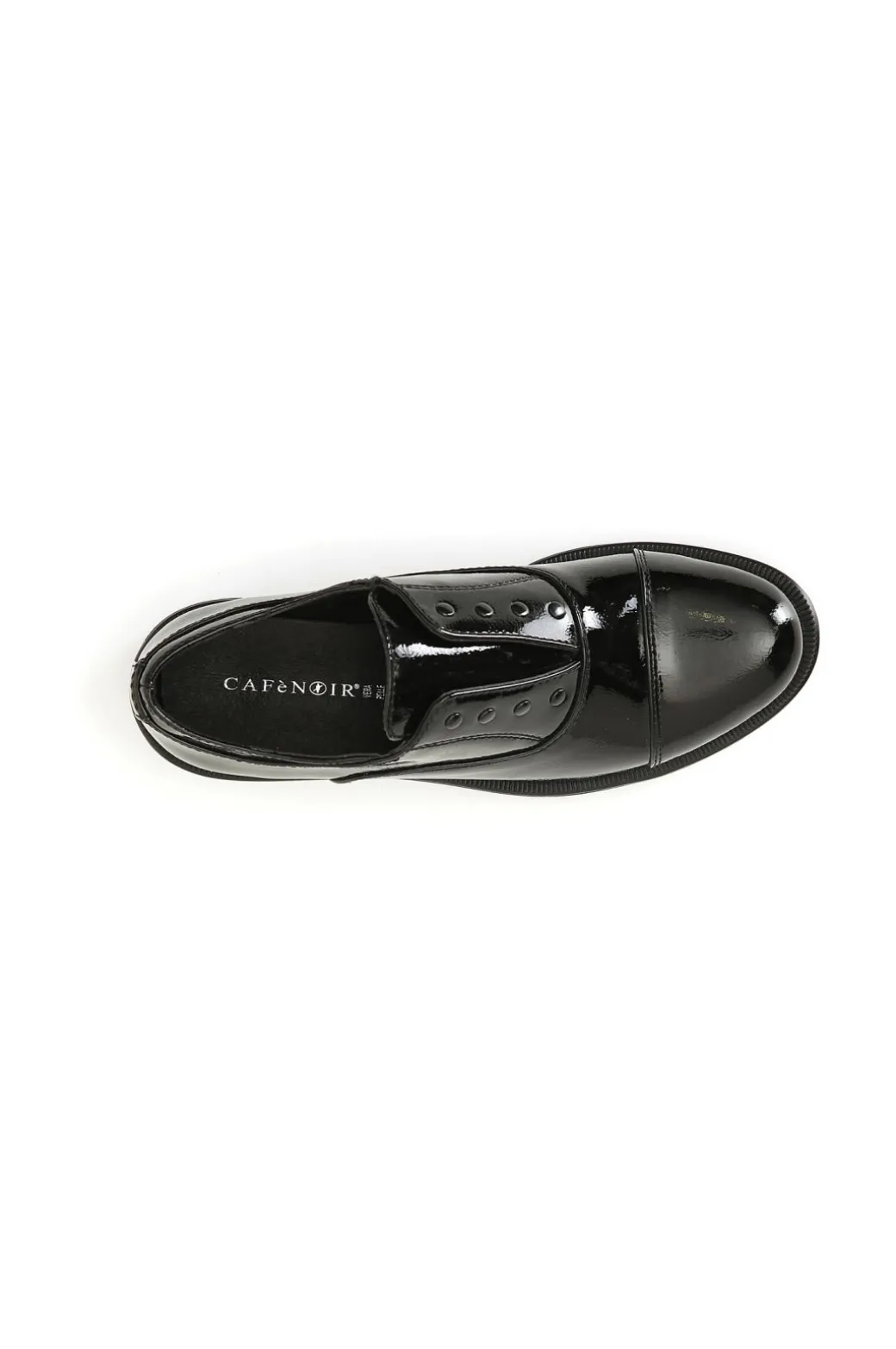 Francesina da donna in similpelle effetto vernice con elastico centrale e borchie. il soletto è in pelle.