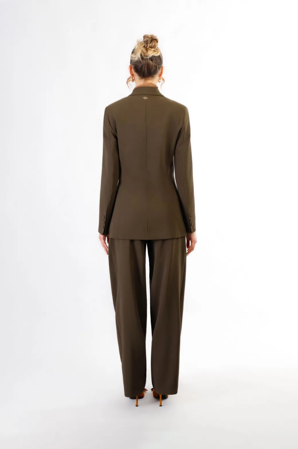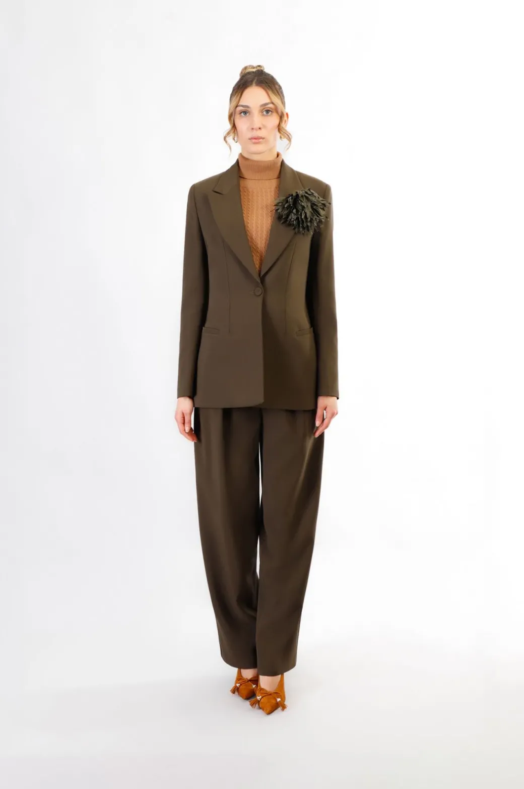 Giacca monopetto over con il collo a lancia realizzata in tessuto bistretch. elegante spilla a fiore. capo intramontabile da abbinare ad un paio di pantaloni skinny o a zampa.