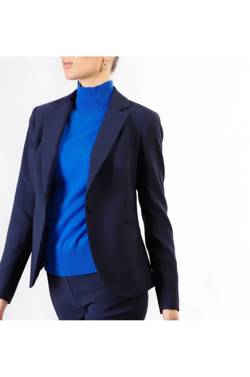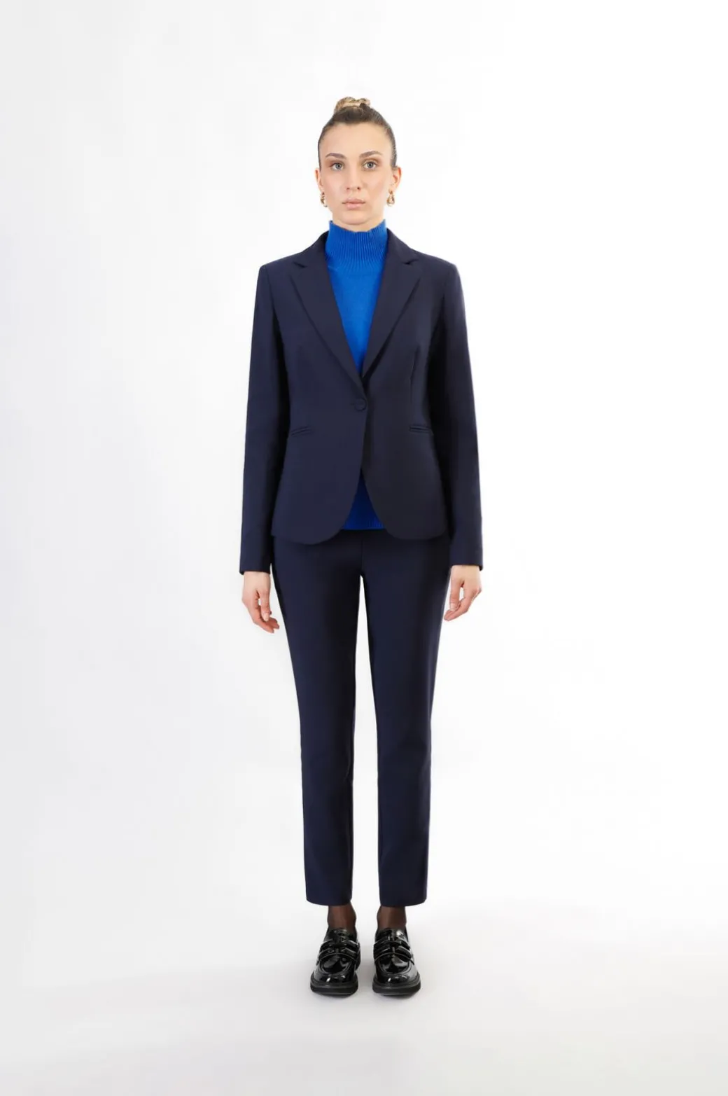 La giacca monopetto è caratterizzata da rever a lancia tasche a filetto bottone singolo e elegante spilla fiore applicato. capo intramontabile in tessuto bistretch da abbinare ad un paio di pantaloni skinny o a zampa.