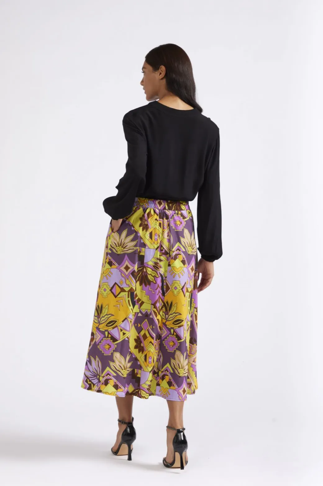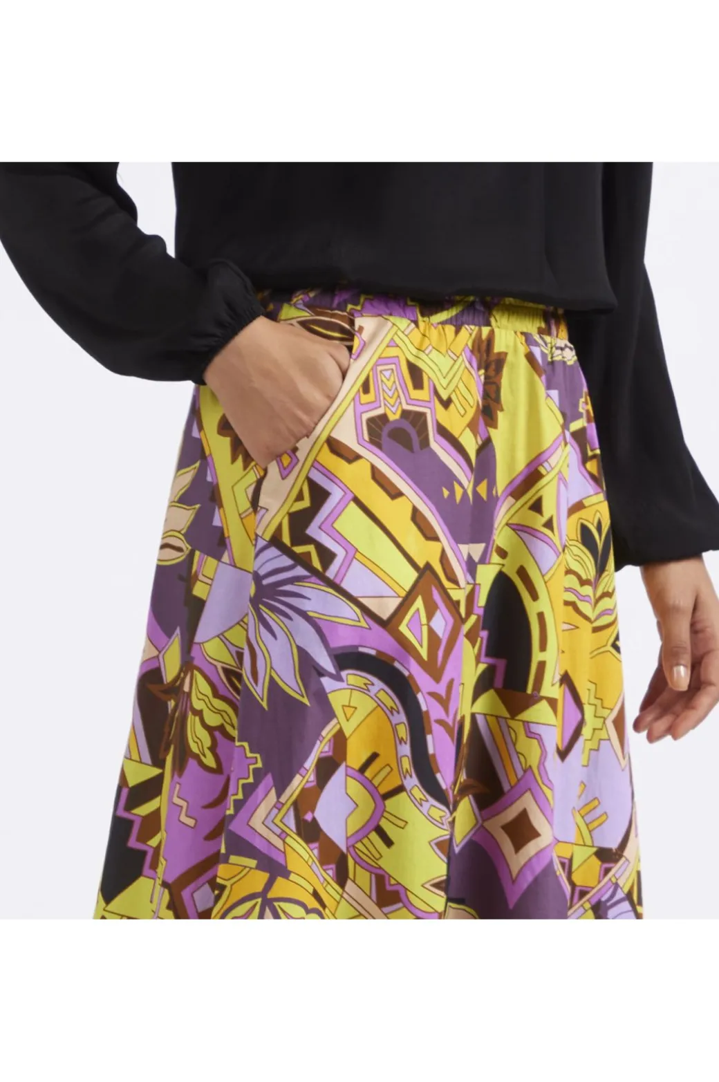 Gonna dalla lunghezza sotto al ginocchio con vita elasticata e tasche laterali. capo realizzato in popeline di cotone stampato.