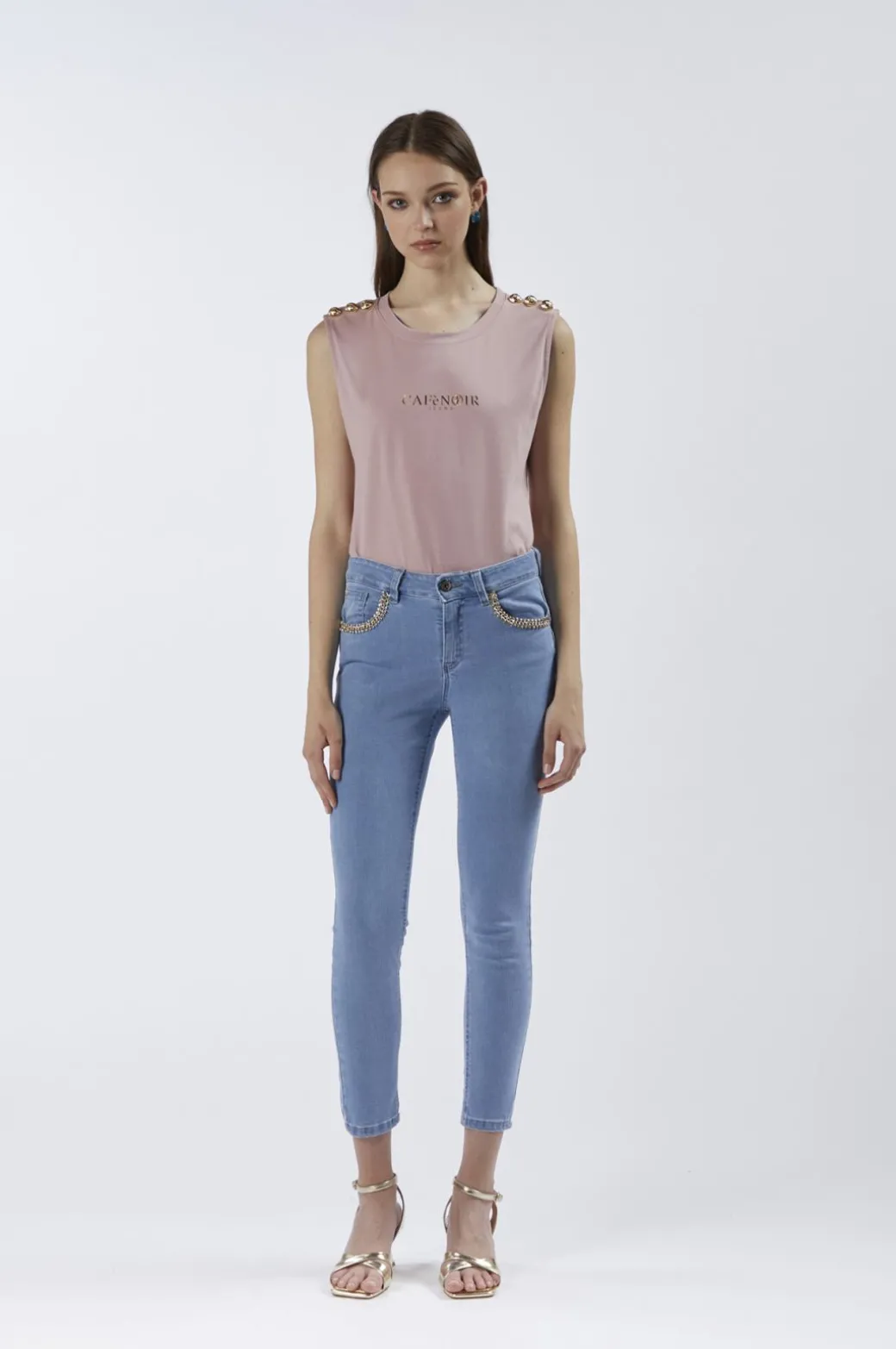 Jeans cinque tasche in tela denim superstretch. catena gioiello alle tasche davanti. vestibilità skinny