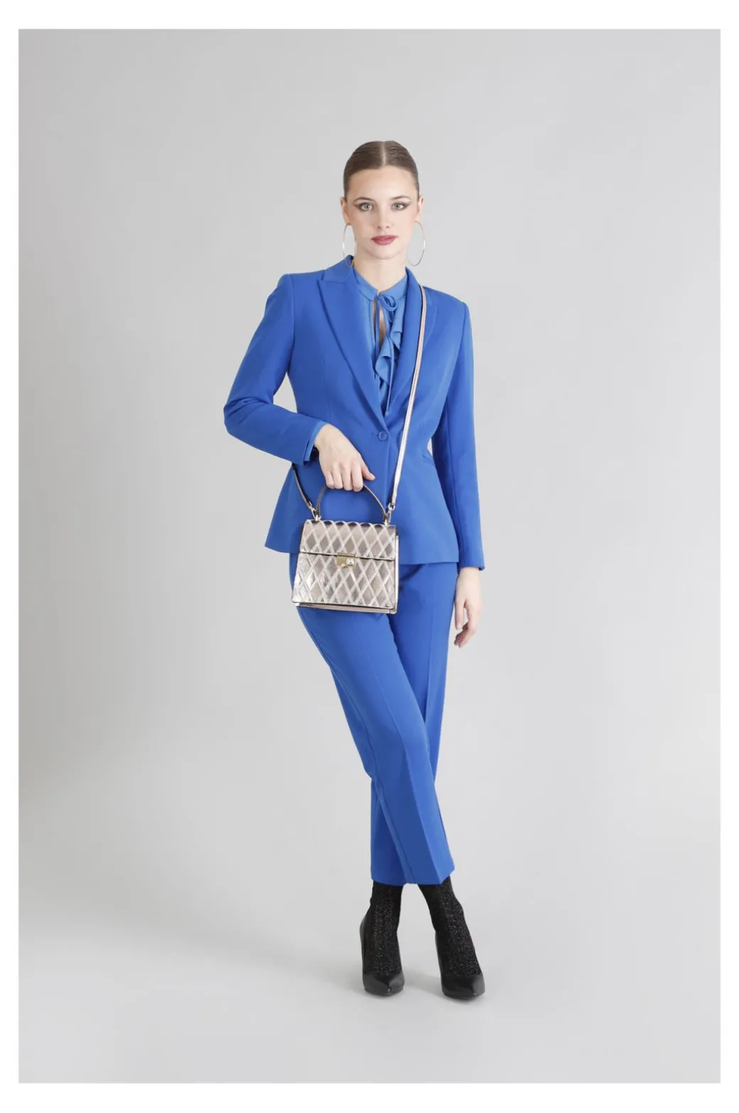 Minibag rigida dai colori metallizzati. patchwork di rombi. unico scomparto e taschino interno con zip. chiusura a scatto con accessorio in strass. borsa dotata di tracolla.