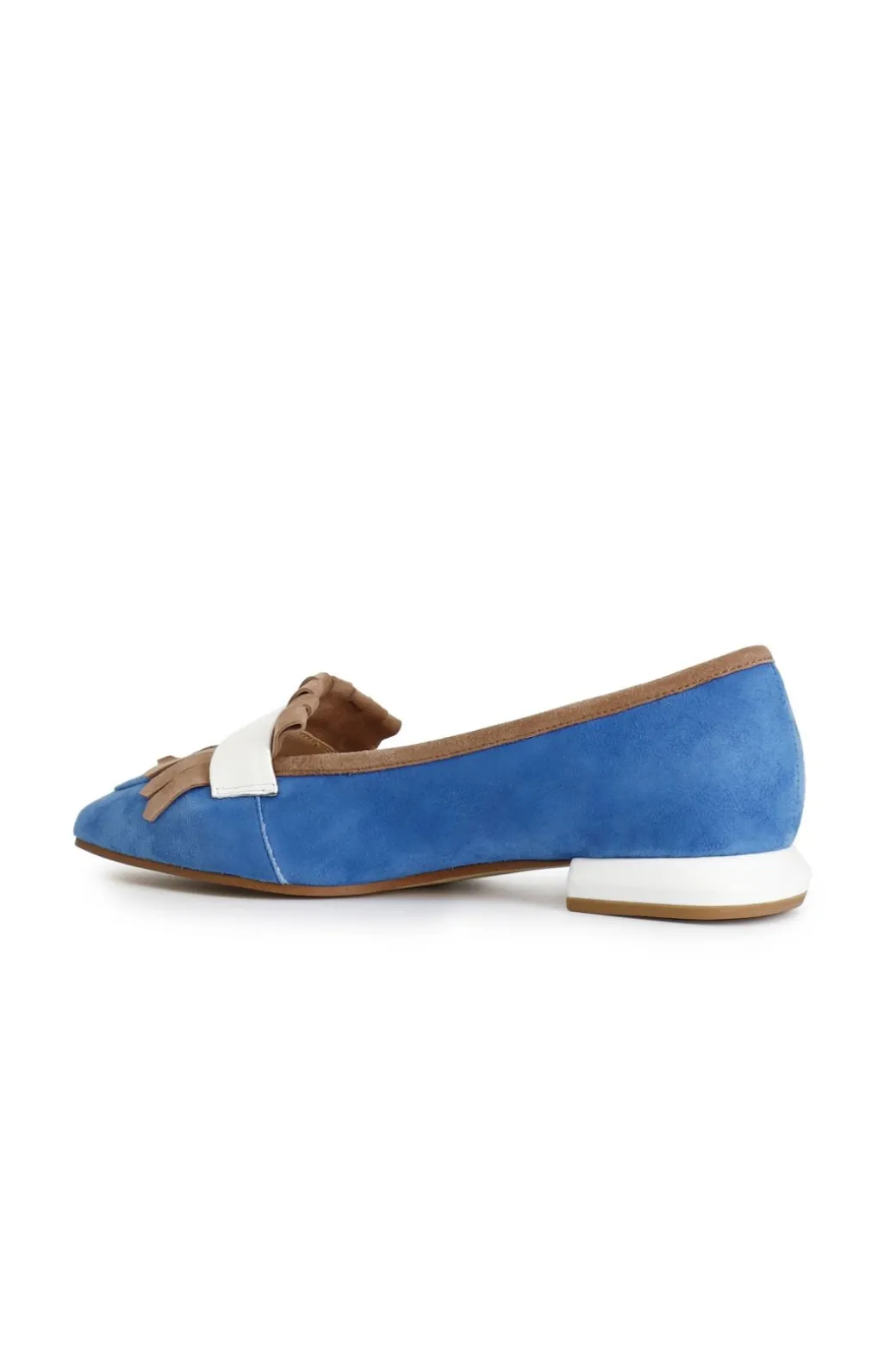 Mocassini in pelle scamosciata con frangia a decoro. tacco fasciato in pelle laminata alto 15mm.