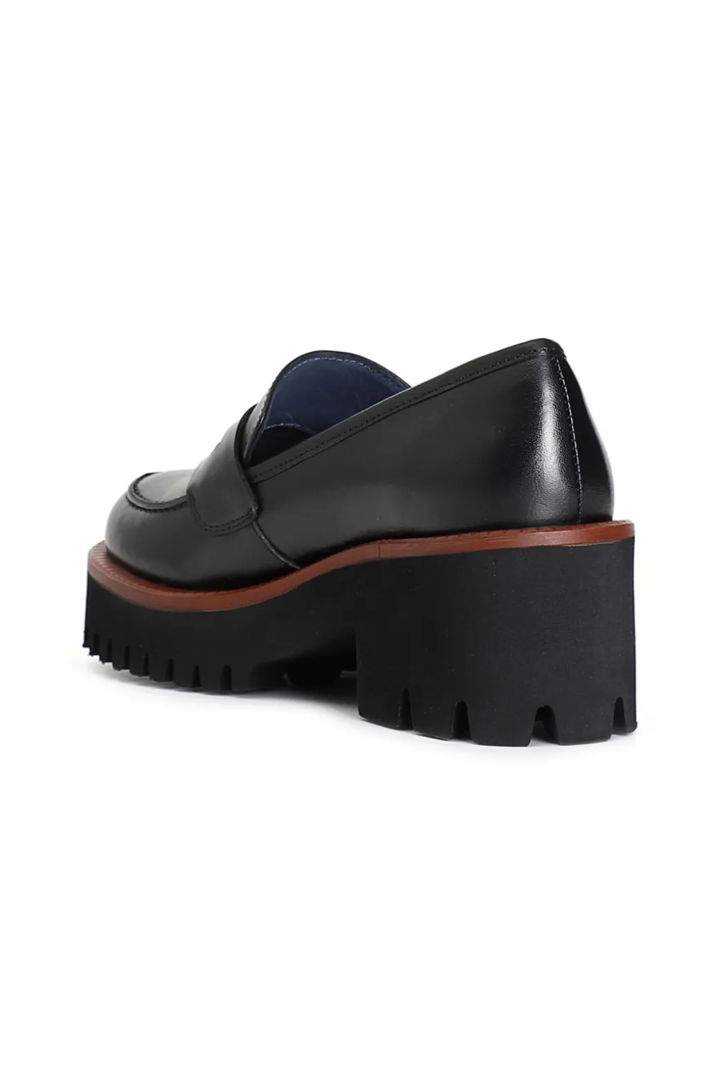 Mocassino da donna in pelle con suola nera e guardolo colorato. suola a carro armato alto 60 mm e plateau di 30 mm. la fodera e il soletto sono in pelle.