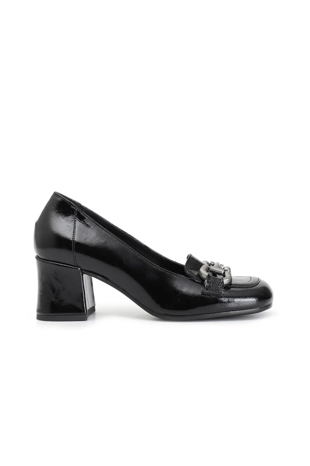 Mocassino da donna in vernice con morsetto sulla tomaia e soletto in pelle. calzatura comoda dallo stile innovativo e raffinato oltre che molto femminile. la punta e il tacco sono squadrati.