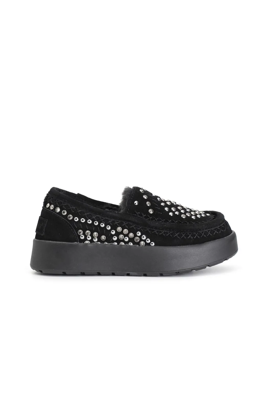 Mocassino da donna con plateau. tomaia in pelle scamosciata e interno in pelliccia sintetica. la calzatura è arricchita da strass borchie e infilature.