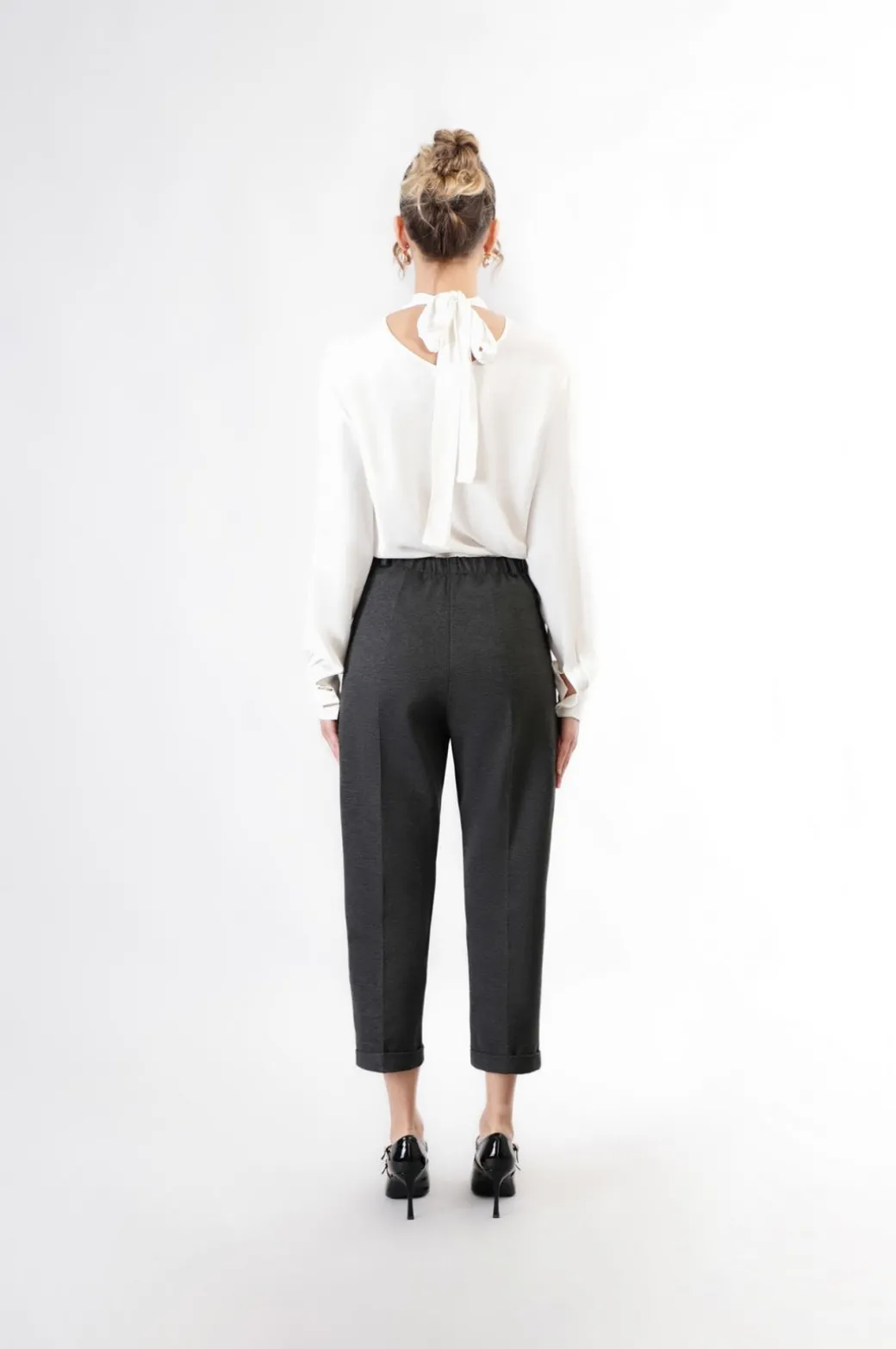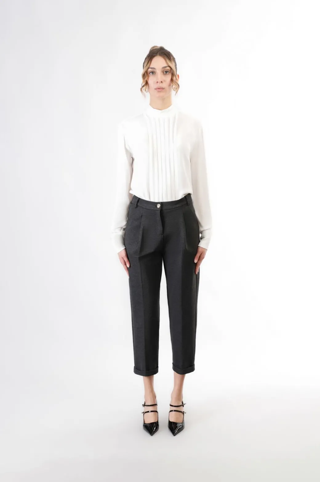 Pantaloni modello a gamba dritta con pinces aperte e risvolto al fondo. capo comodo con vita elasticata sul retro e realizzato in tessuto elasticizzato. pratici e confortevoli con l’intento di vestire al meglio tutte le fisicità per stare bene ed essere a proprio agio ogni volta che vengono indossati.