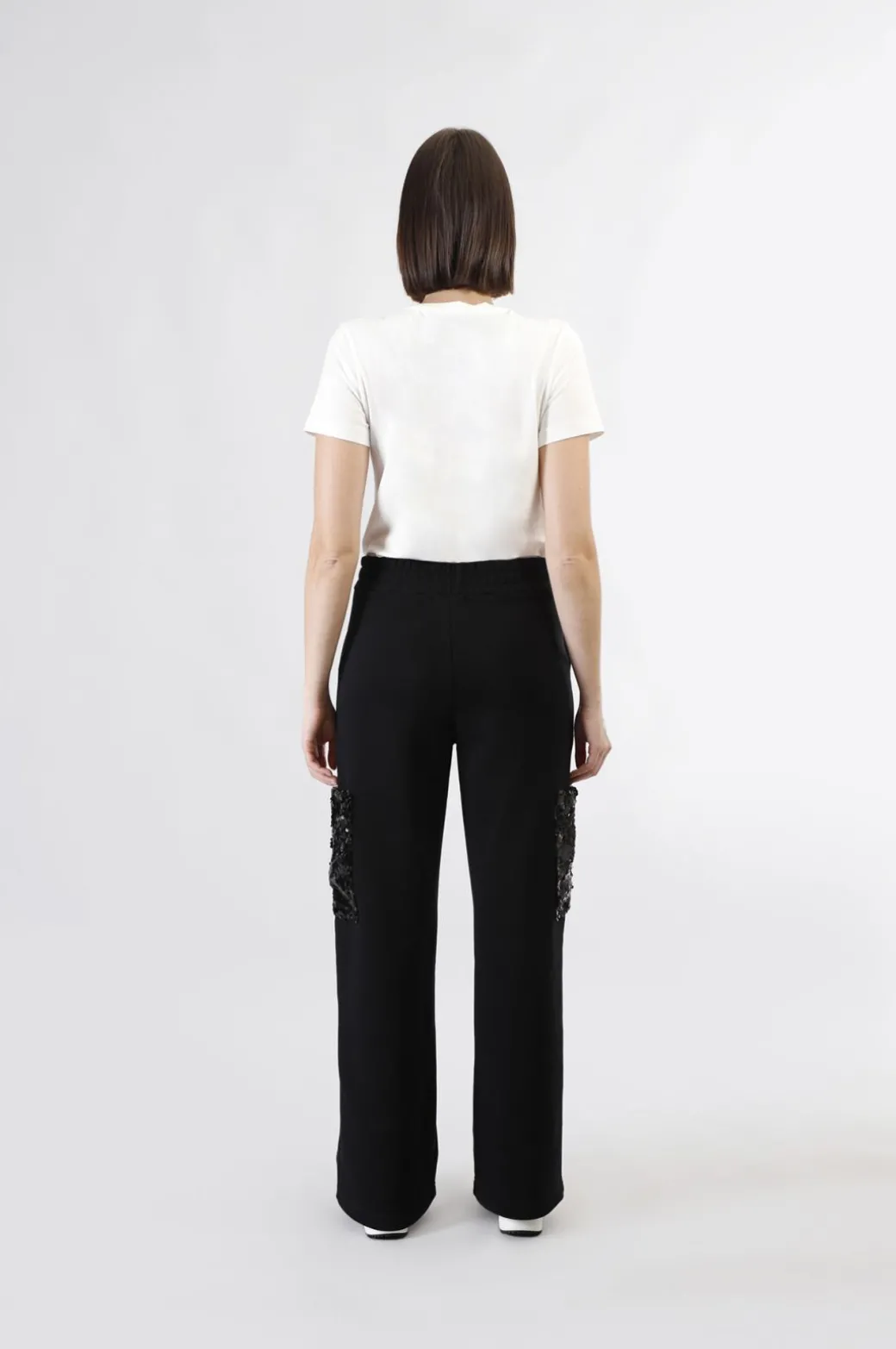 Pantaloni a gamba dritta modello cargo realizzati in felpa di cotone. le tasche a toppa sono in tessuto di pailettes. capo estremamente comodo funzionale e di tendenza.