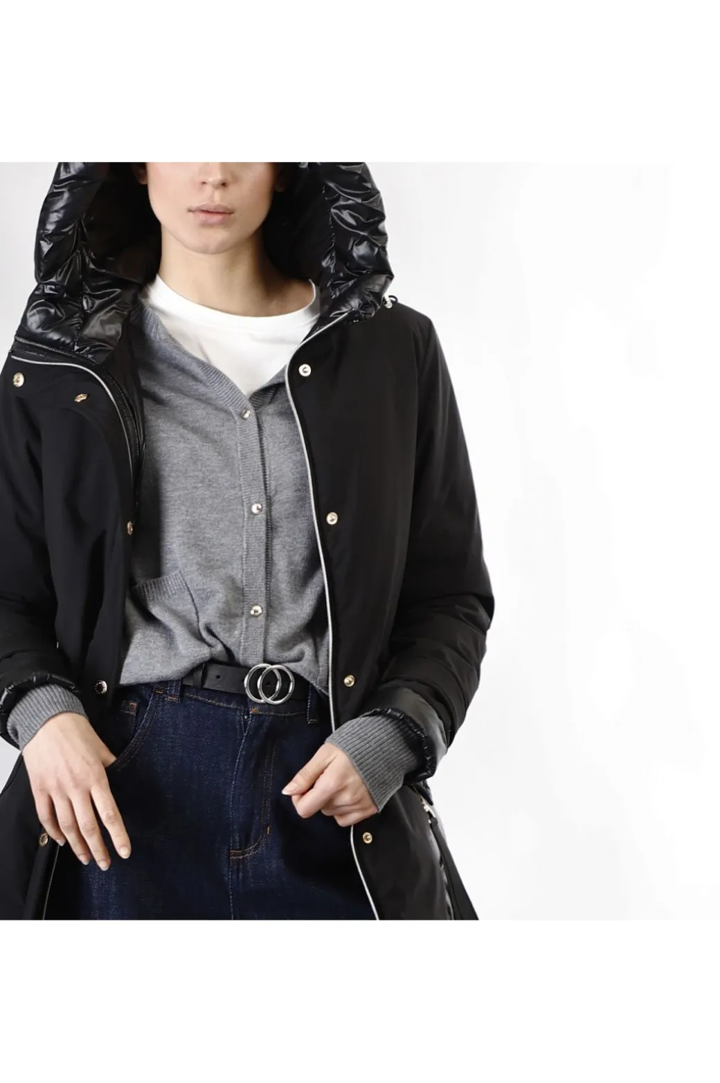 Parka bimateriale con cappuccio fisso. capo perfetto per una vita frenetica di tutti i giorni. da indossare per andare al lavoro quando il maltempo si fa sentire per una passeggiata all’aria aperta con la famiglia o le amiche.