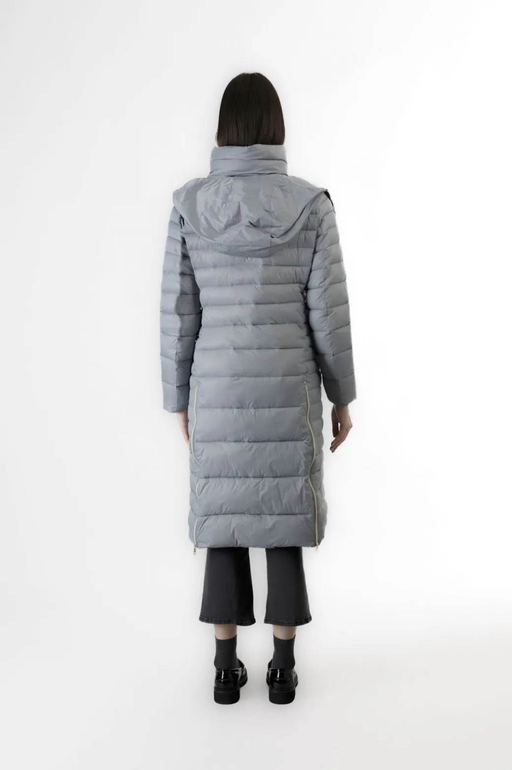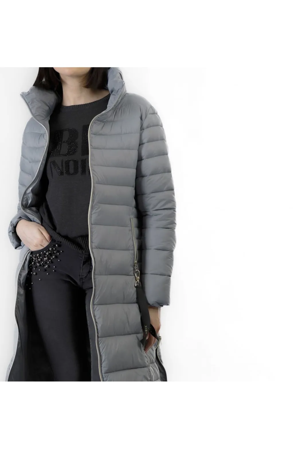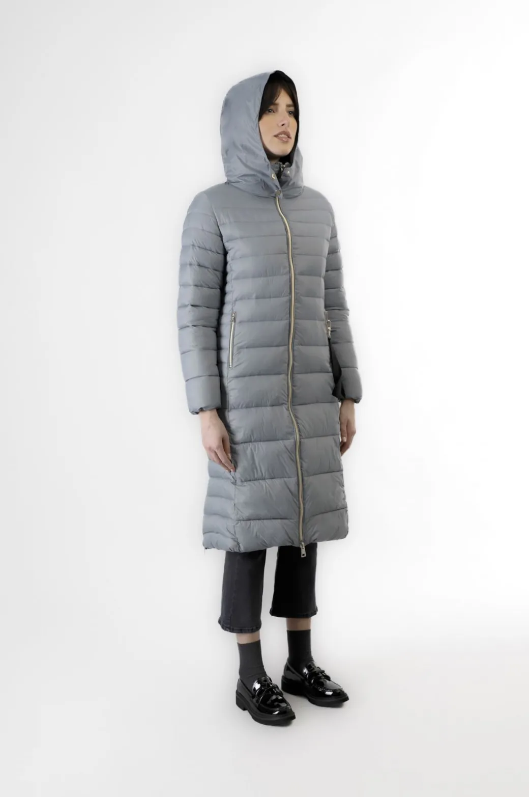 Piumino lungo con collo avvolgente realizzato in nylon ultraligth. colletto avvolgente e caldo. chiusura con zip doppio cursore. zip sul fianco per agevolare i movimenti. capo classico e versatile perfetto per le fredde giornate invernali.