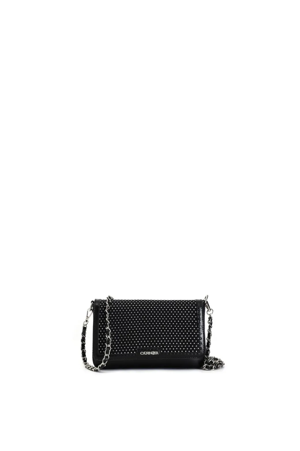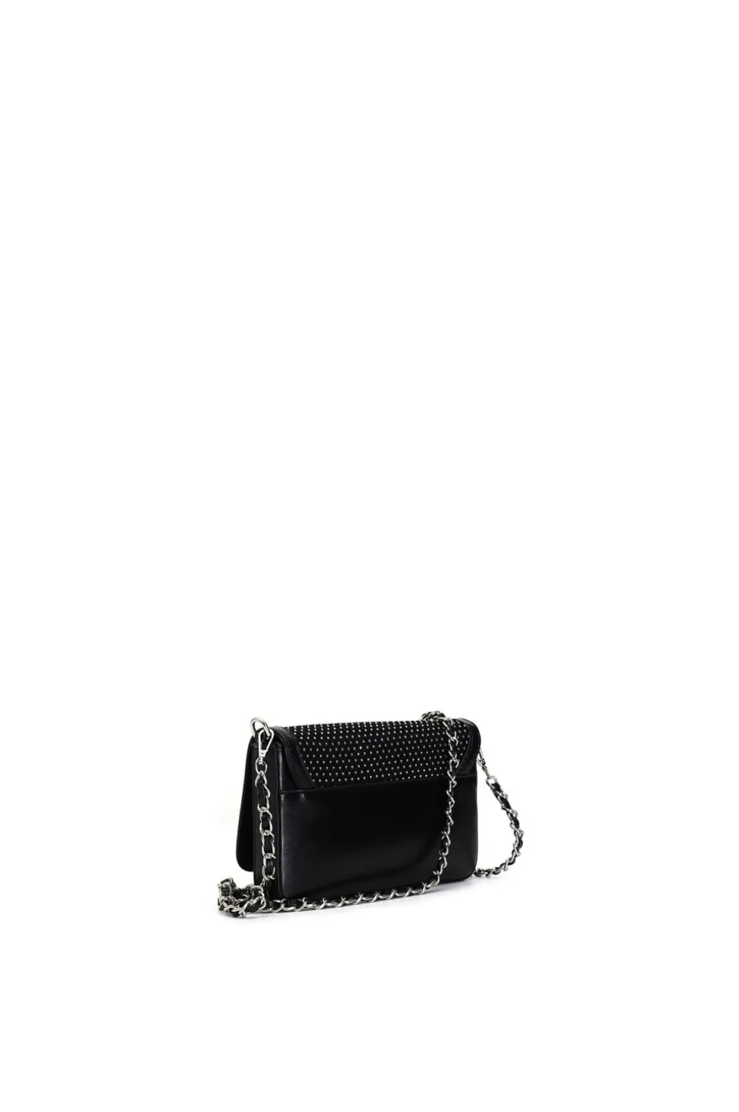 Pochette effetto laminato in rete e strass. tracolla con catena infilatura removibile. chiusura con calamita.