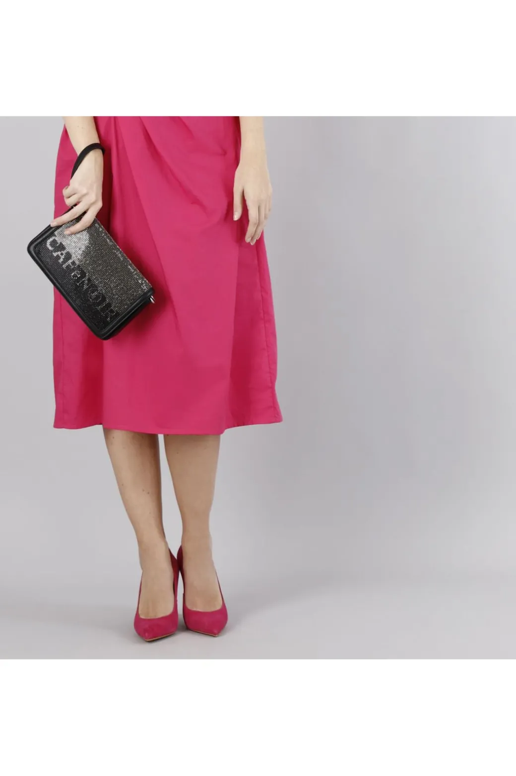 Pochette con pattina. logo cafènoir in strass bicolor. la parte dietro è effetto specchio. manigliotto e tracolla.