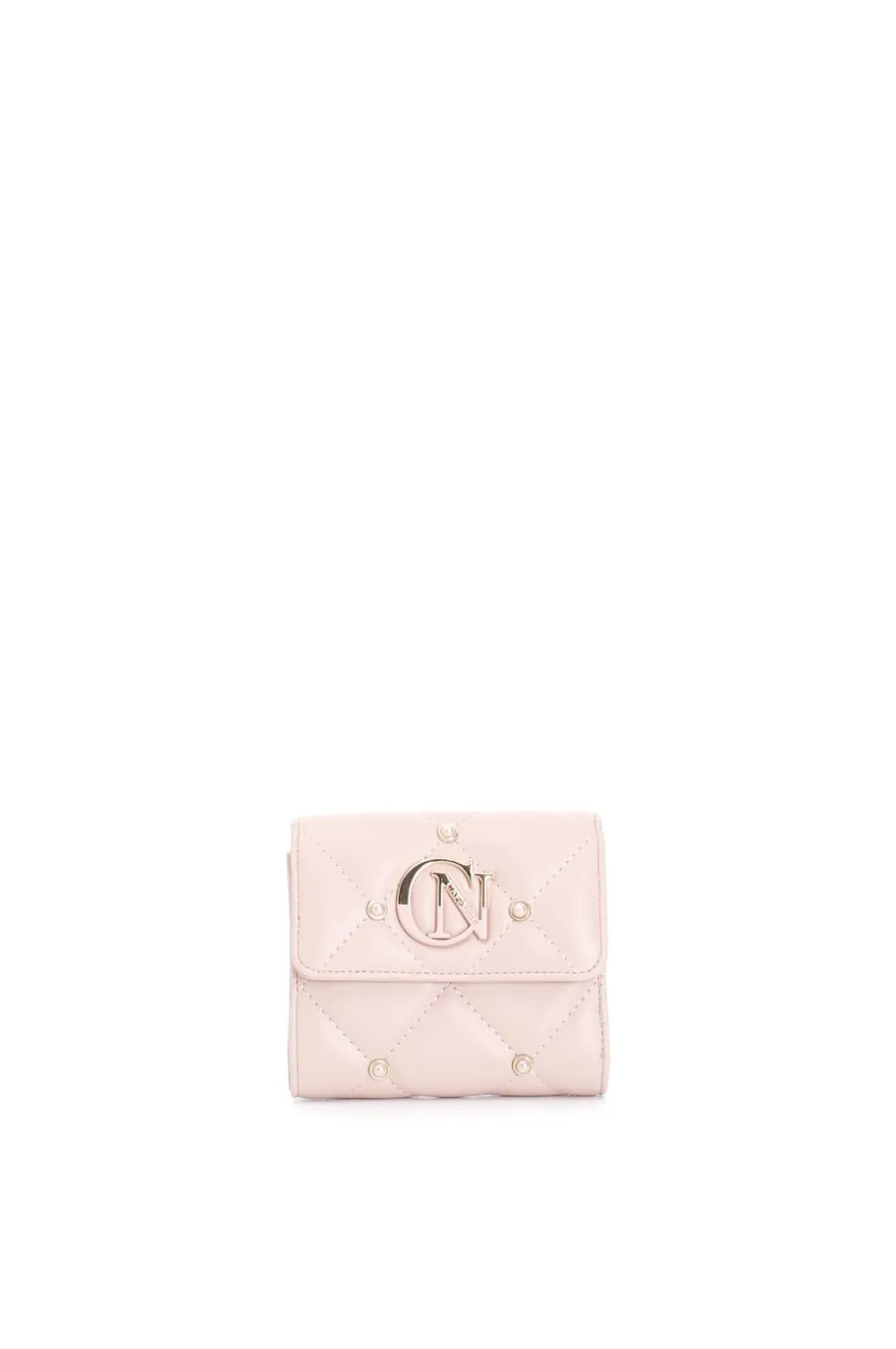 portafoglio con pattina con applicazone di rivetti colorati e logo bicolore cipria
