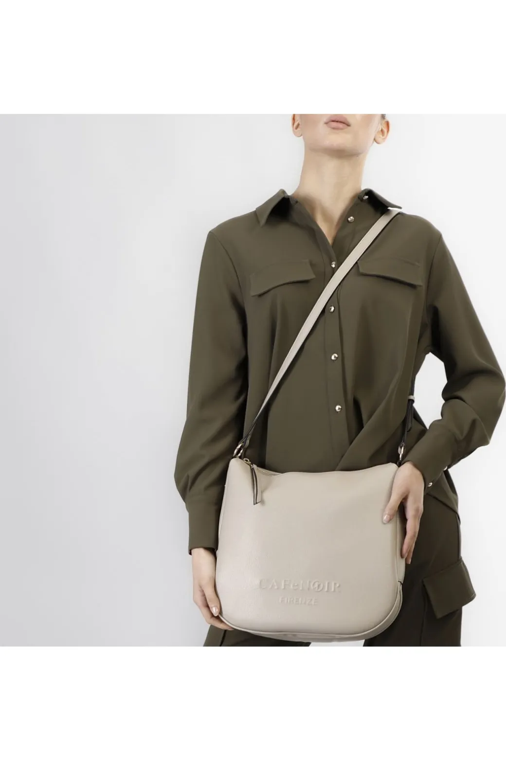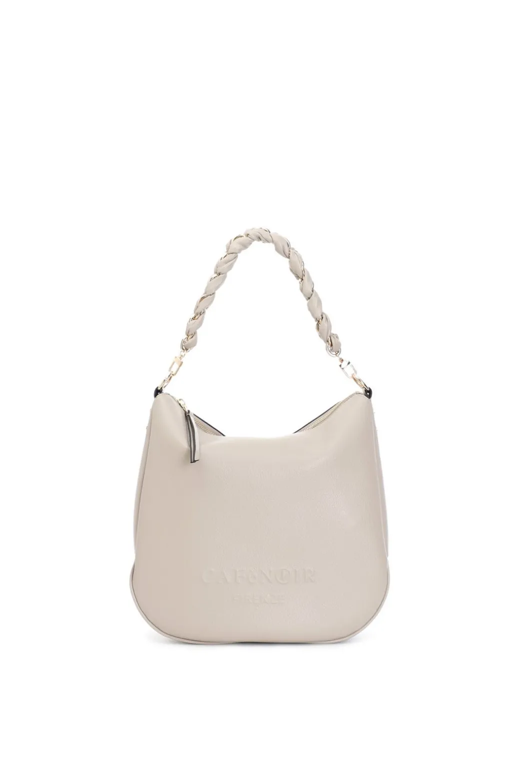 Sacca con logo cafènoir firenze in rilievo e tracolla in catena intrecciata. chiusura con cerniera. tracolla removibile.