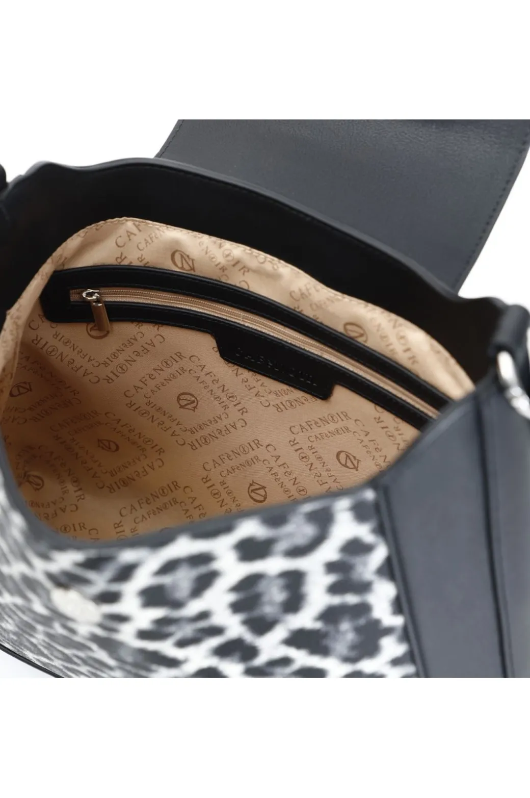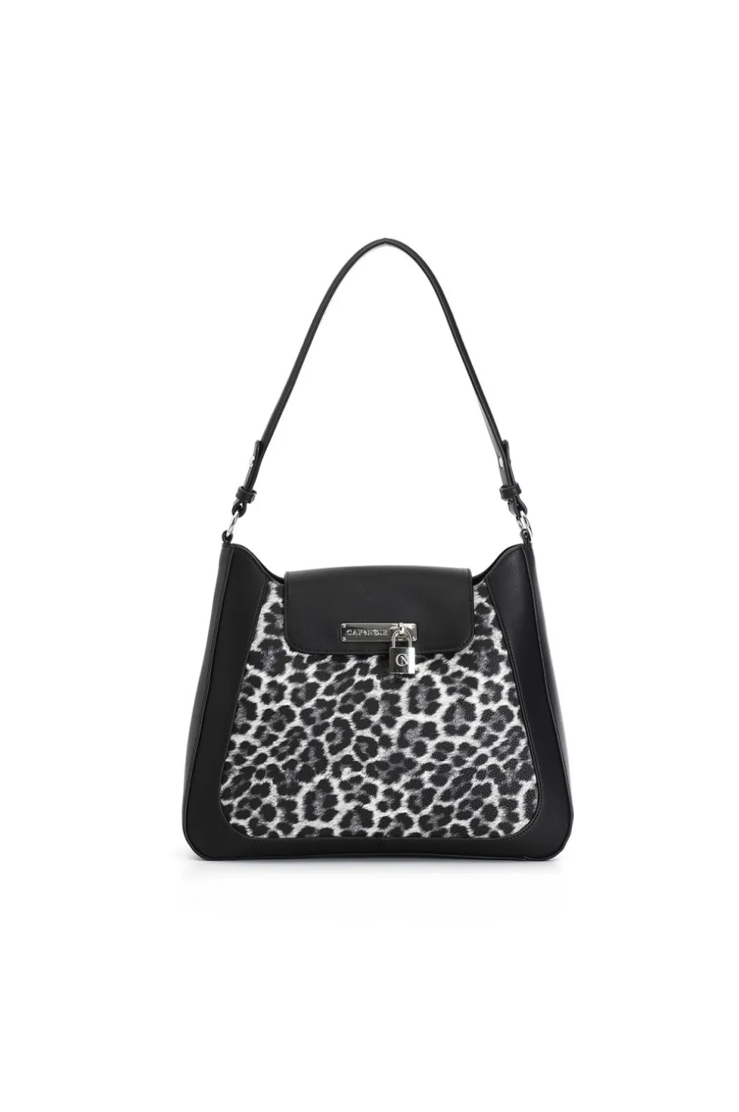 Sacca rigida con accessorio lucchetto logato cafènoir. borsa dal gusto grintoso realizzato con tessuto maculato per chi non ha paura di osare. borsa tracolla come optional.