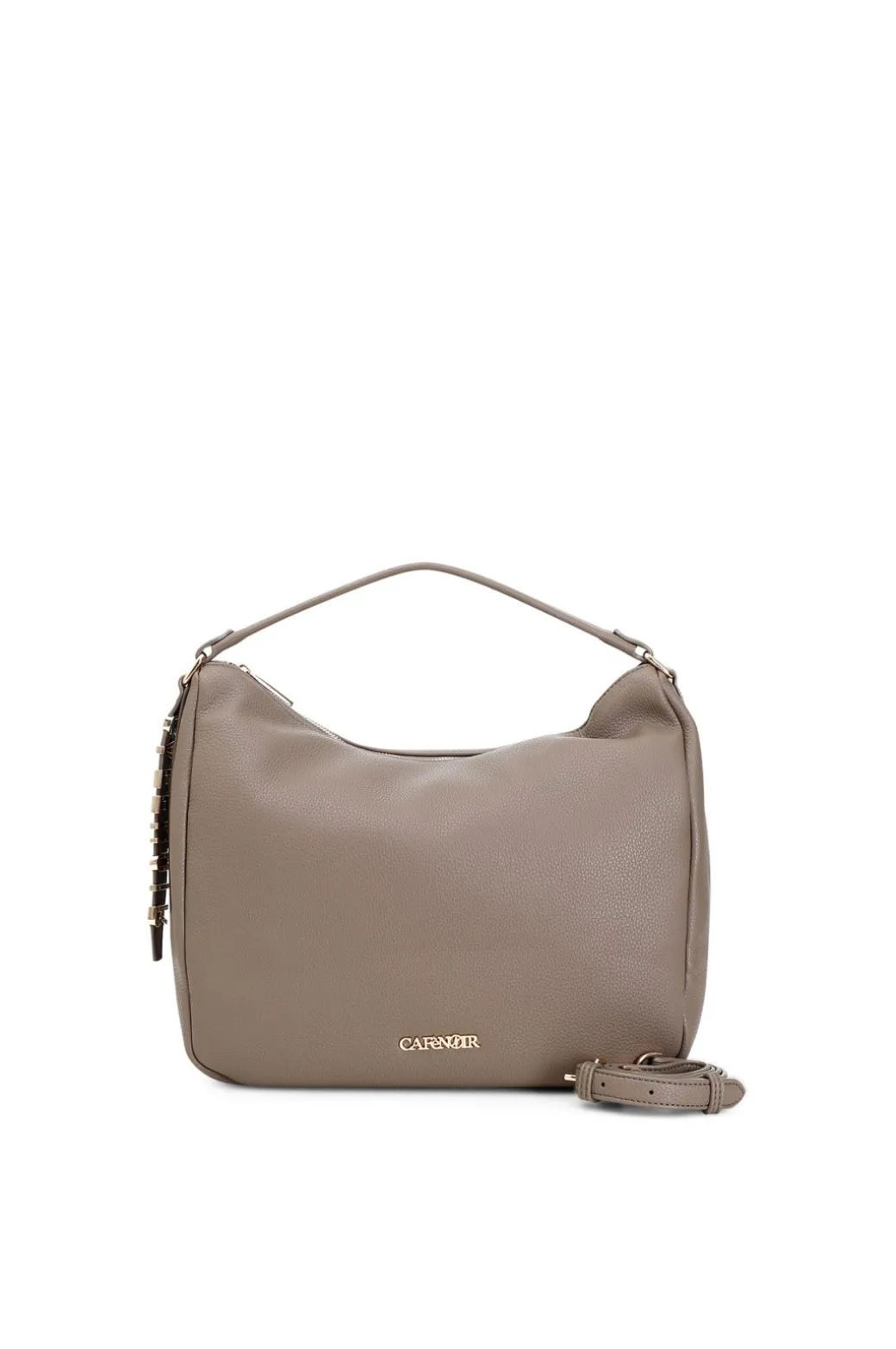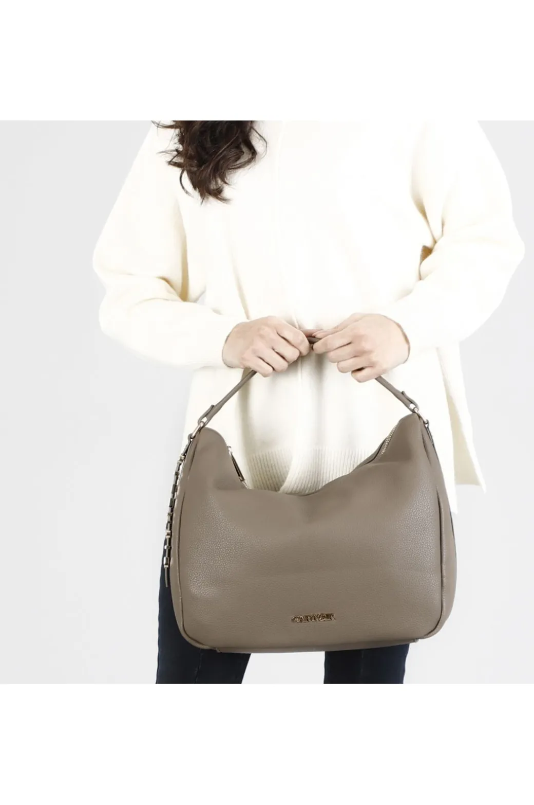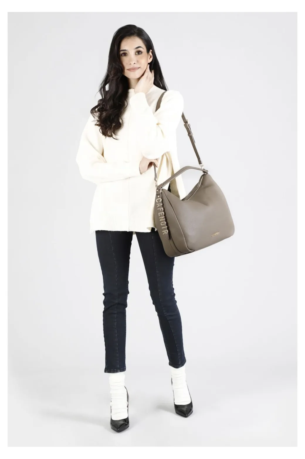 Sacca con materiale morbido e taschino sul davanti, apertura con cerniera e lettere metalliche CafèNoir