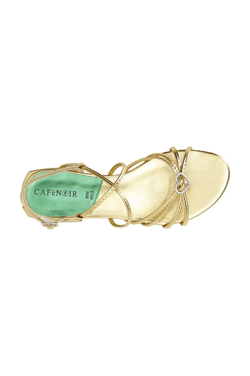 Sandali con multilistini con effetto laminato caratterizzato da un doppio incrocio. accessorio frontale a forma di cuore. comodo soletto imbottito per una calzata morbida. tacco alto 20mm. comodi da indossare e facili da abbinare.