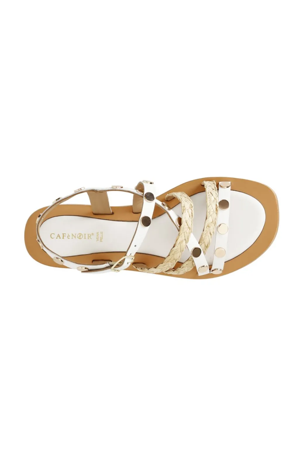 Sandali con fasce in pelle e rafia alternate decorate da borchie dorate.