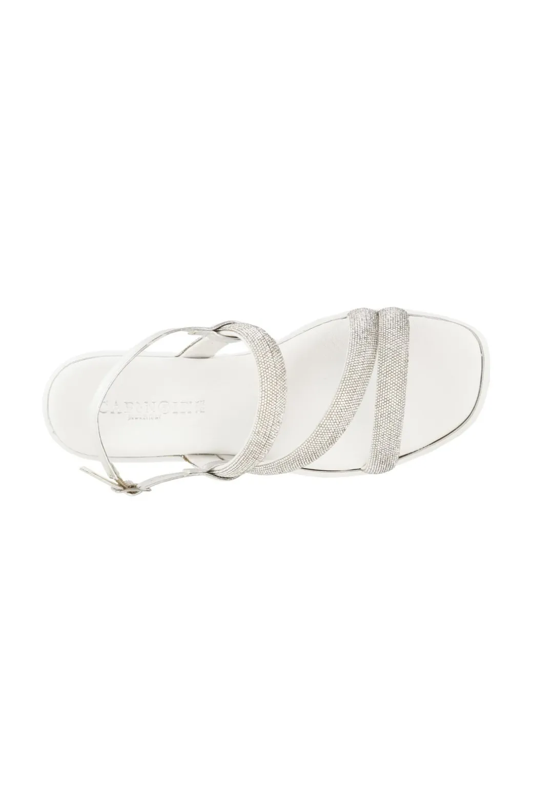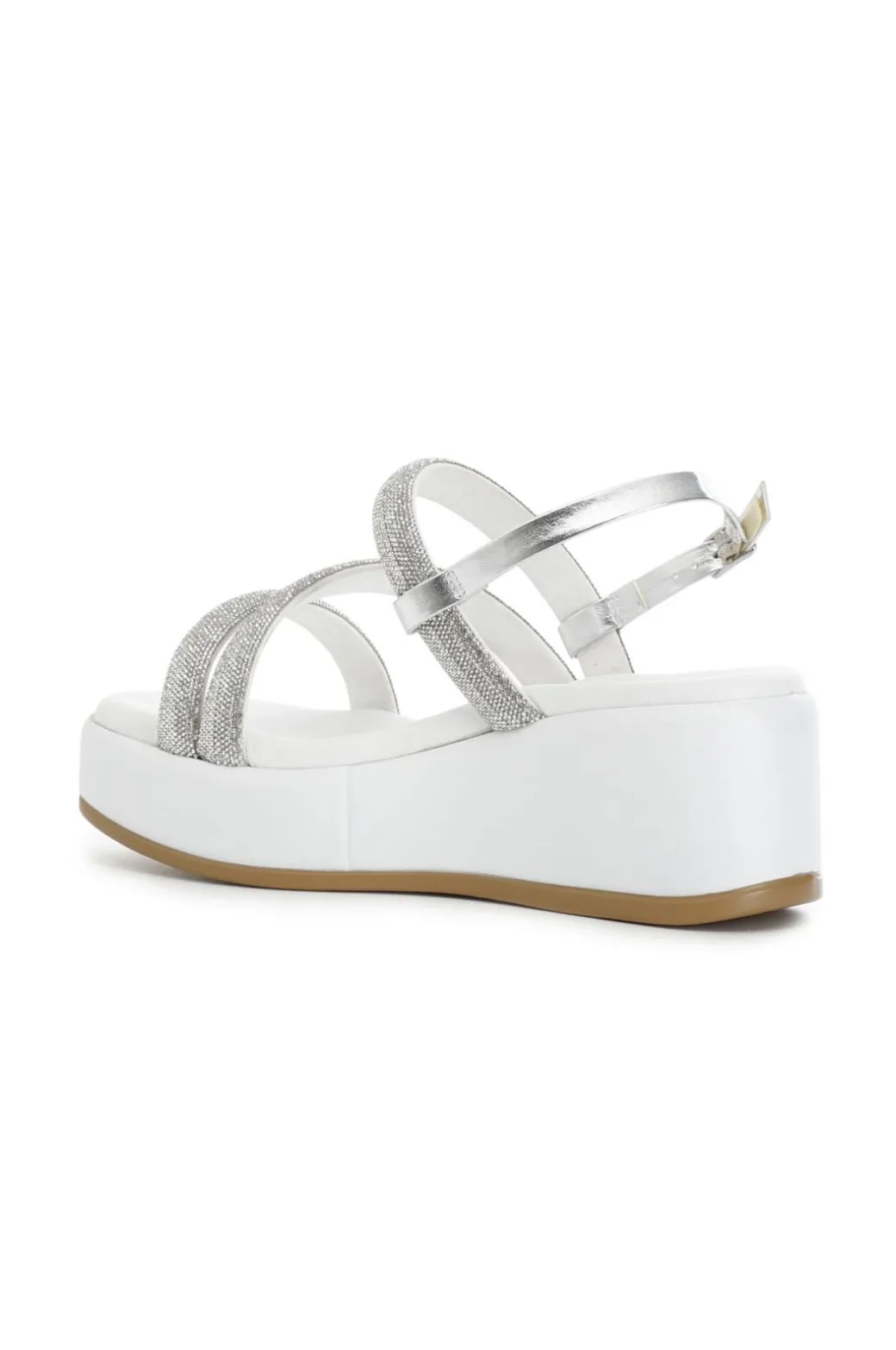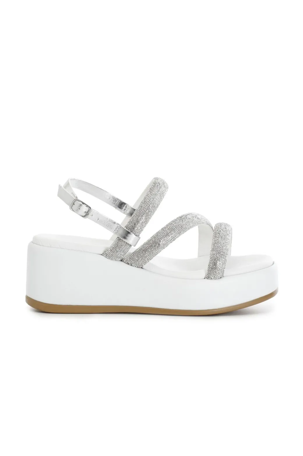 Sandali asimmetrici con fasce ricoperte da microstrass. una comoda e ampia zeppa con soletto imbottito fasciato in nappa.