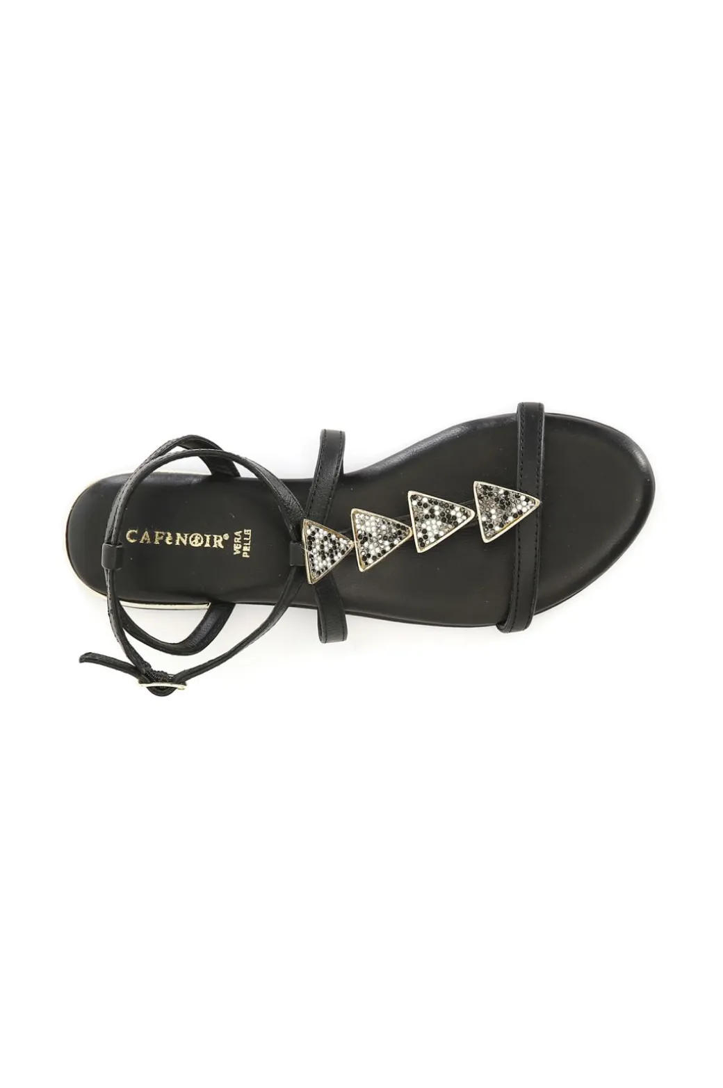 Sandali donna in pelle. accessorio triangoli fatti di strass. cinturino con fibbia alla caviglia.