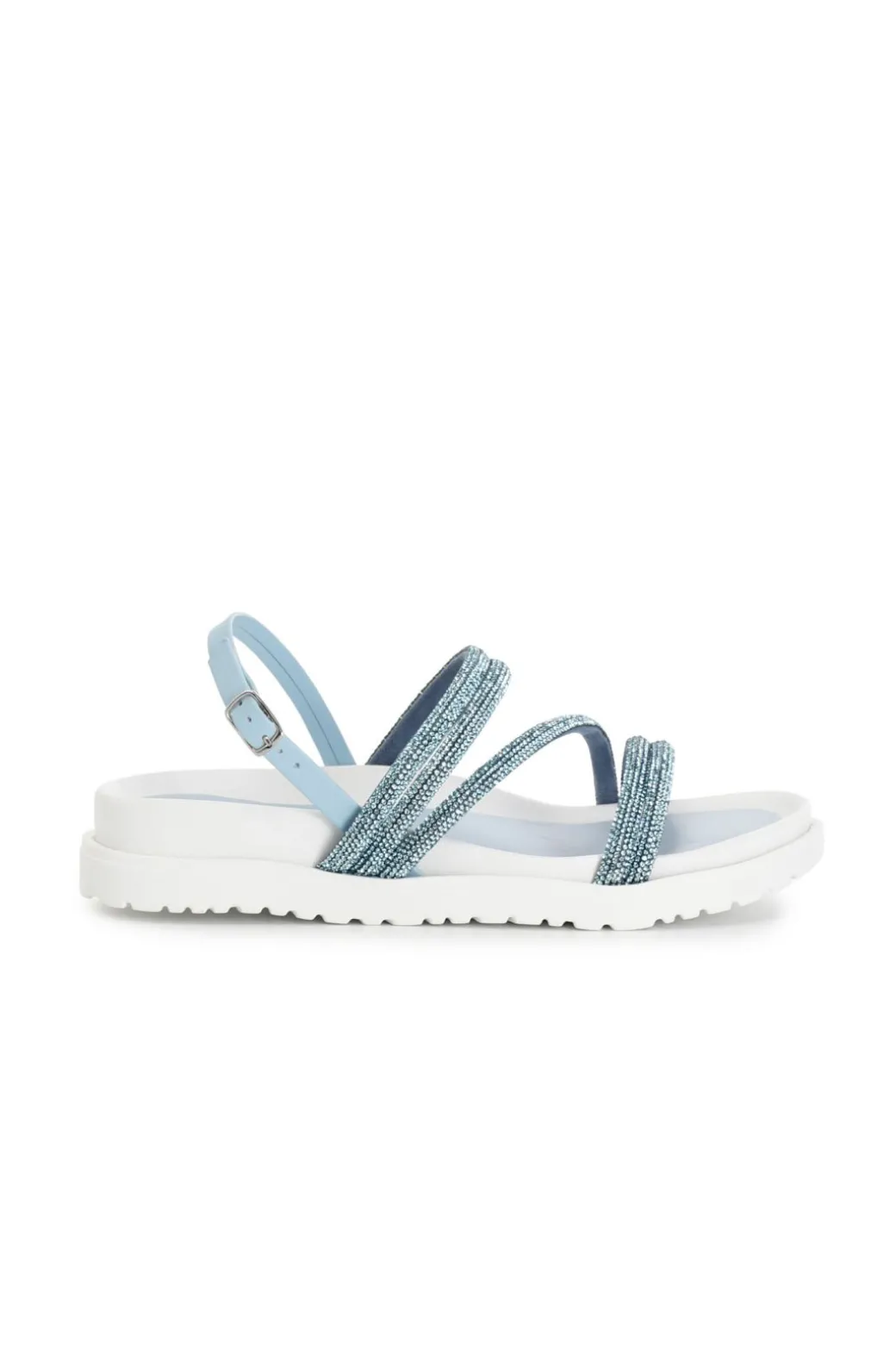 Sandali asimmetrici con cinque fasce ricoperte da strass sottopiede in pelle su comodo footbed.