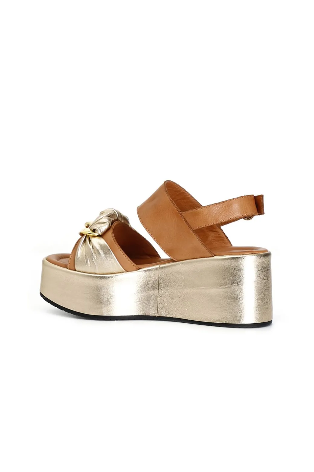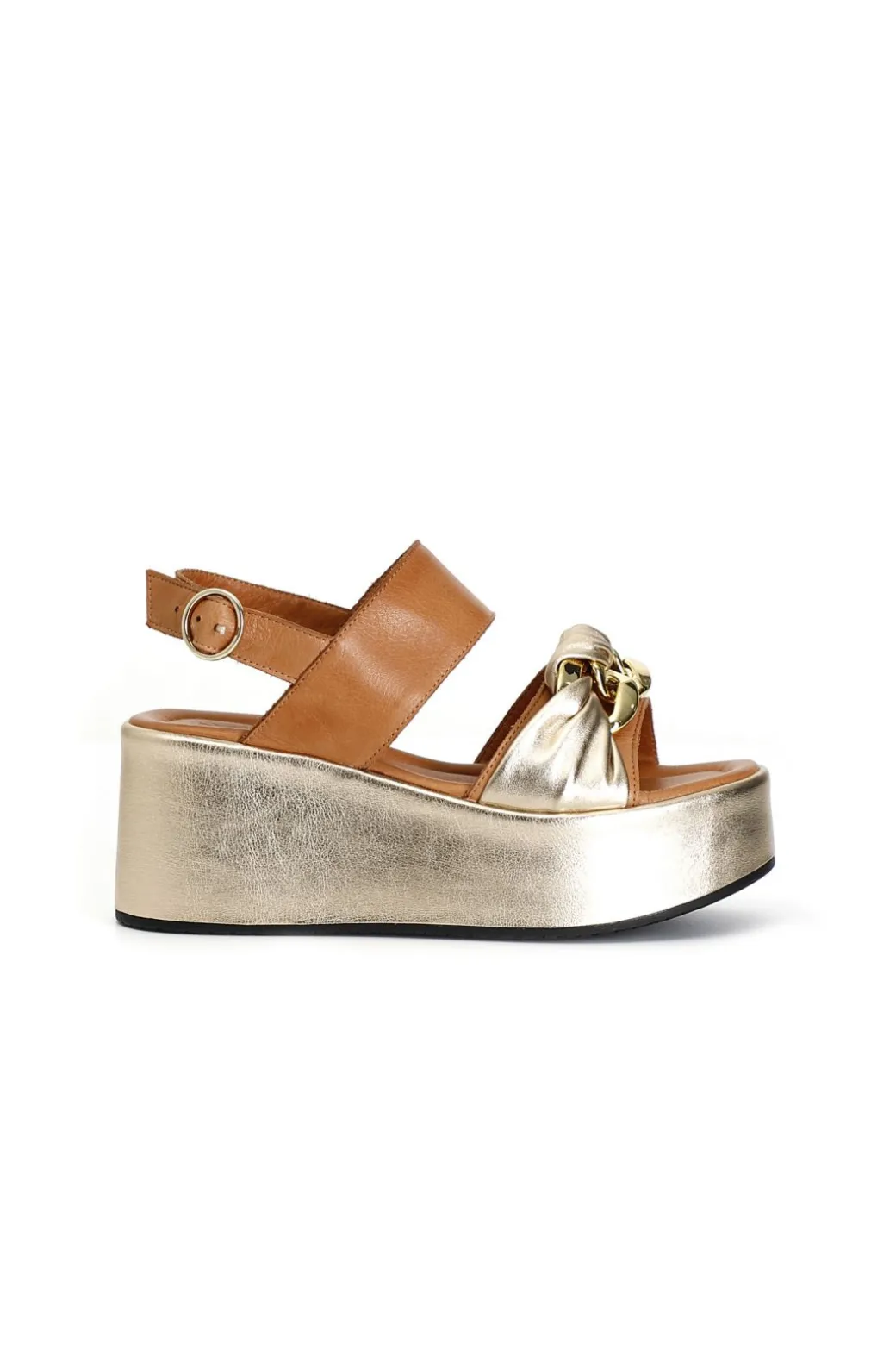 Sandali frate laminati in pelle bicolor su zeppa con accessorio catena.
