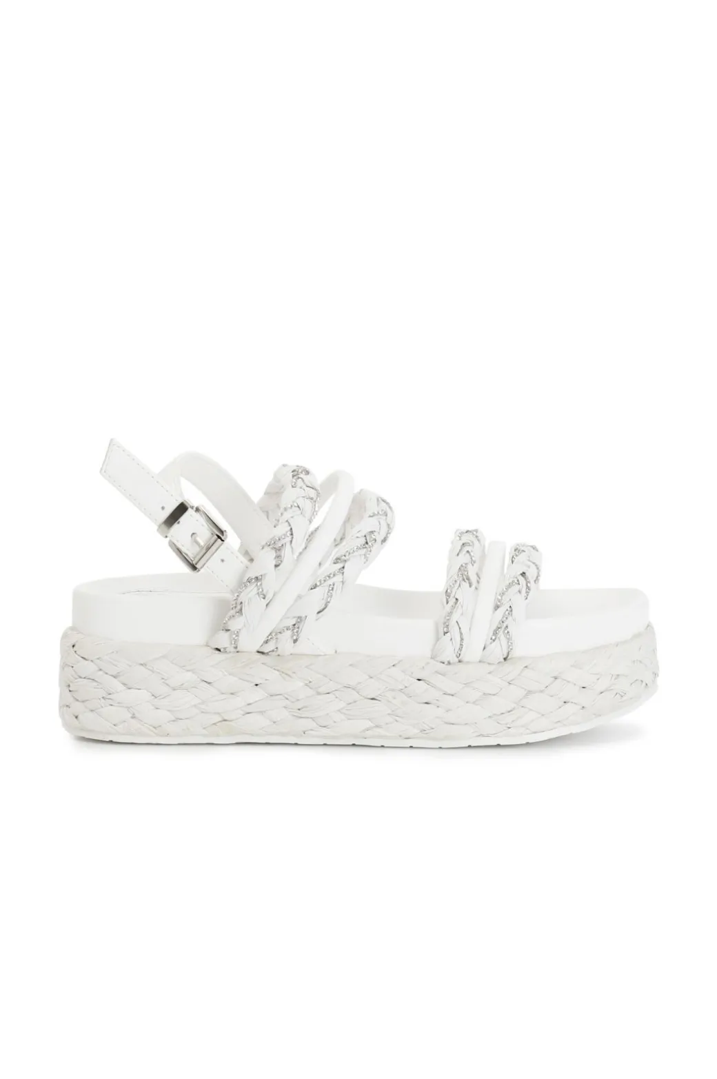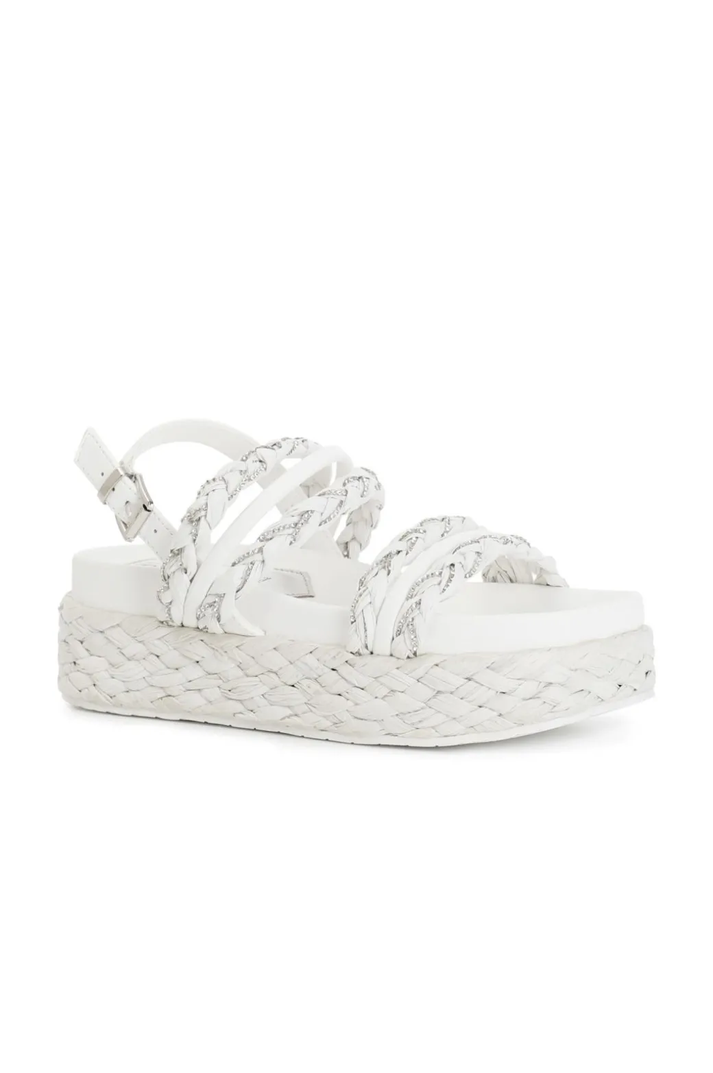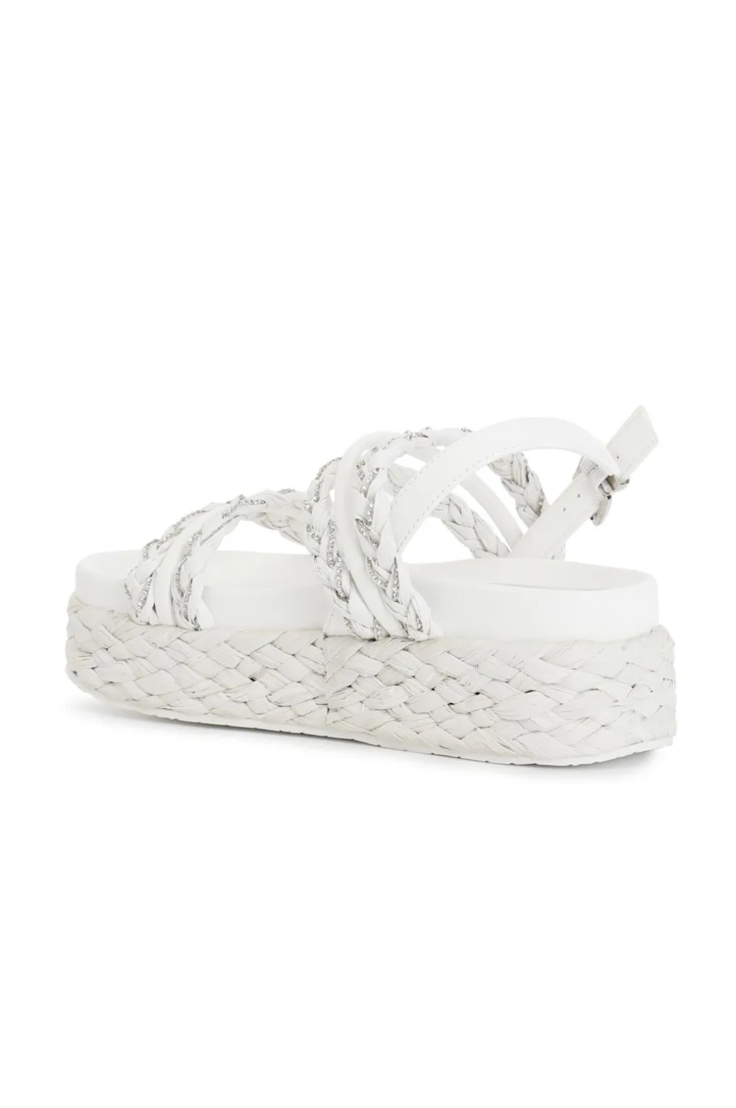 Sandali frate color block in raffia intrecciata con inserto strass. comodo footbed e la zeppa è fasciata in raffia.