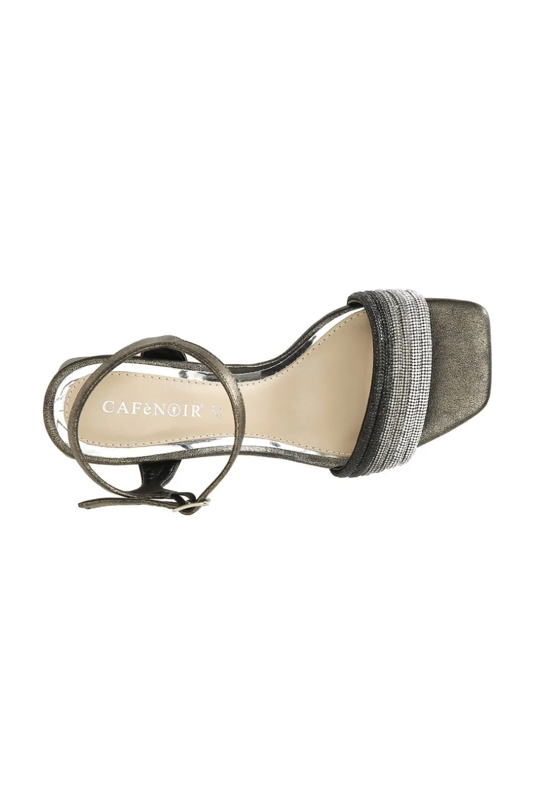 Sandali modello gilda effetto laminato con fasce sul davanti in strass. il soletto imbottito in vera pelle fa risultare la calzatura comoda anche dopo svariate ore di utilizzo. il tacco è di 50mm.