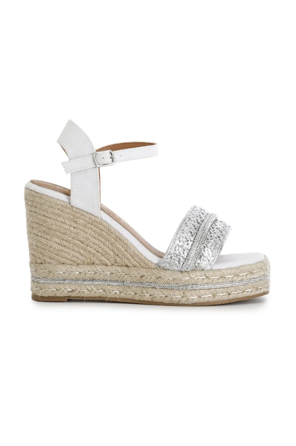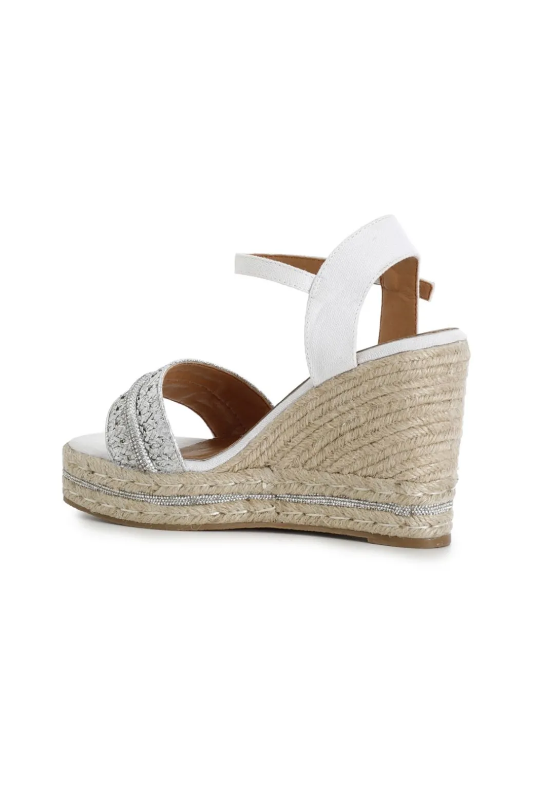 Sandali modello gilda in rafia e inserto in microstrass. zeppa corda impreziosita da una fascia in microstrass.