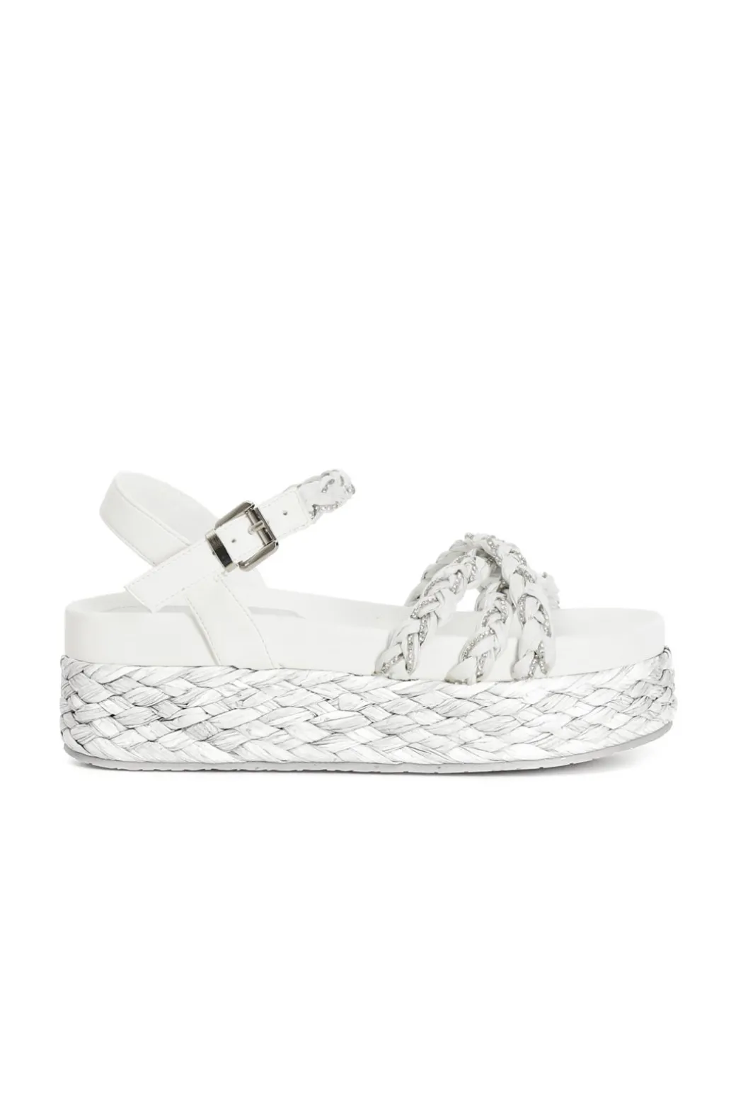 Sandali modello gilda color block con tre fasce in raffia intrecciate tra loro e con inserto in strass. comodo footbed e la zeppa è fasciata in raffia.