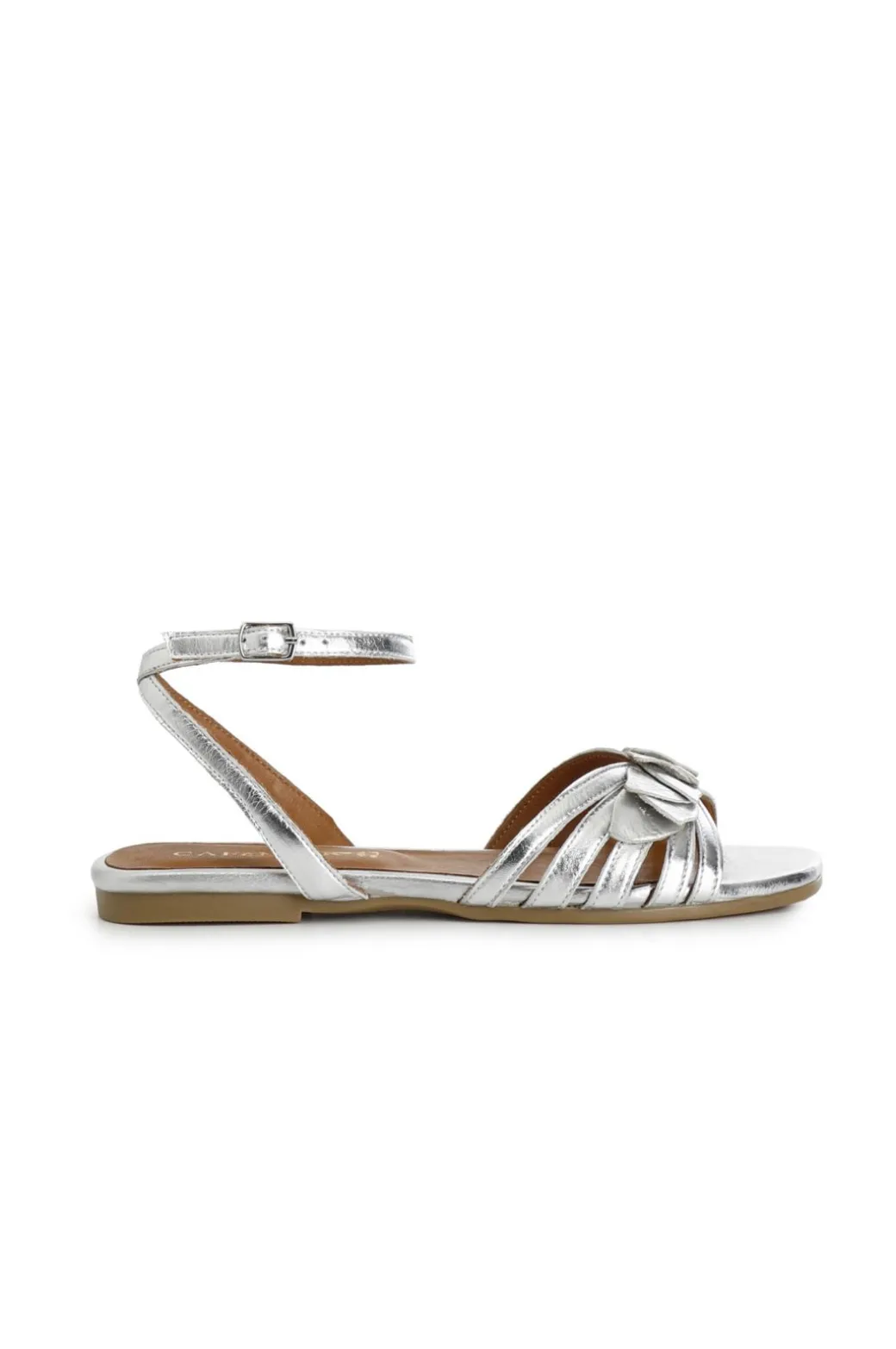 Sandali bassi in pelle laminata con laccio alla caviglia e decoro frontale simile ad un intreccio di foglie.