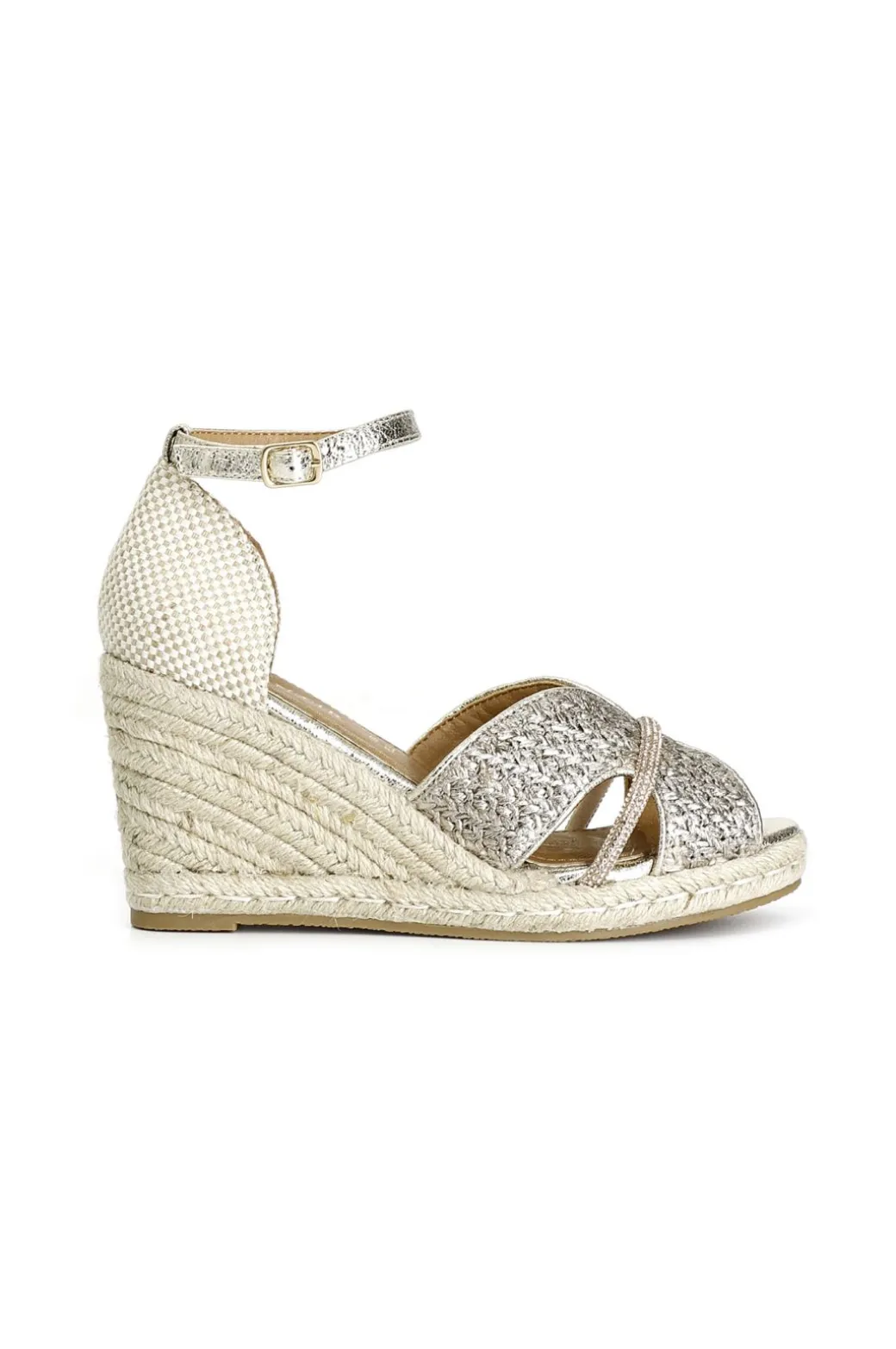 Sandali con zeppa e plateux in corda realizzata in tessuto intrecciato e con una fascia ricoperta da microstrass e laccio alla caviglia.