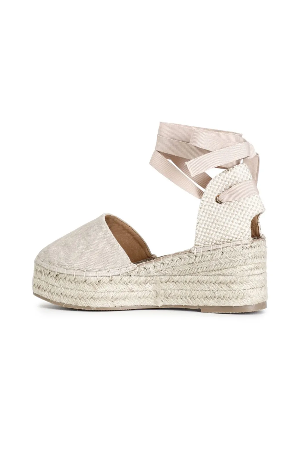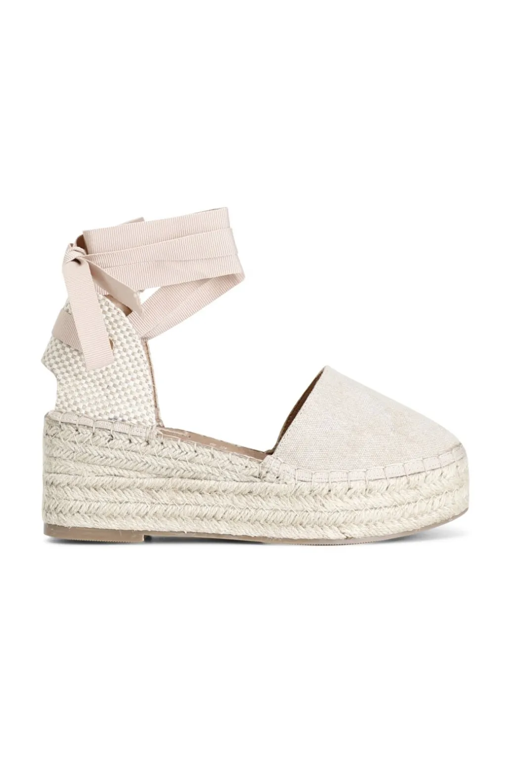 Sandali in tessuto con allacciatura alla schiava su zeppa in corda.