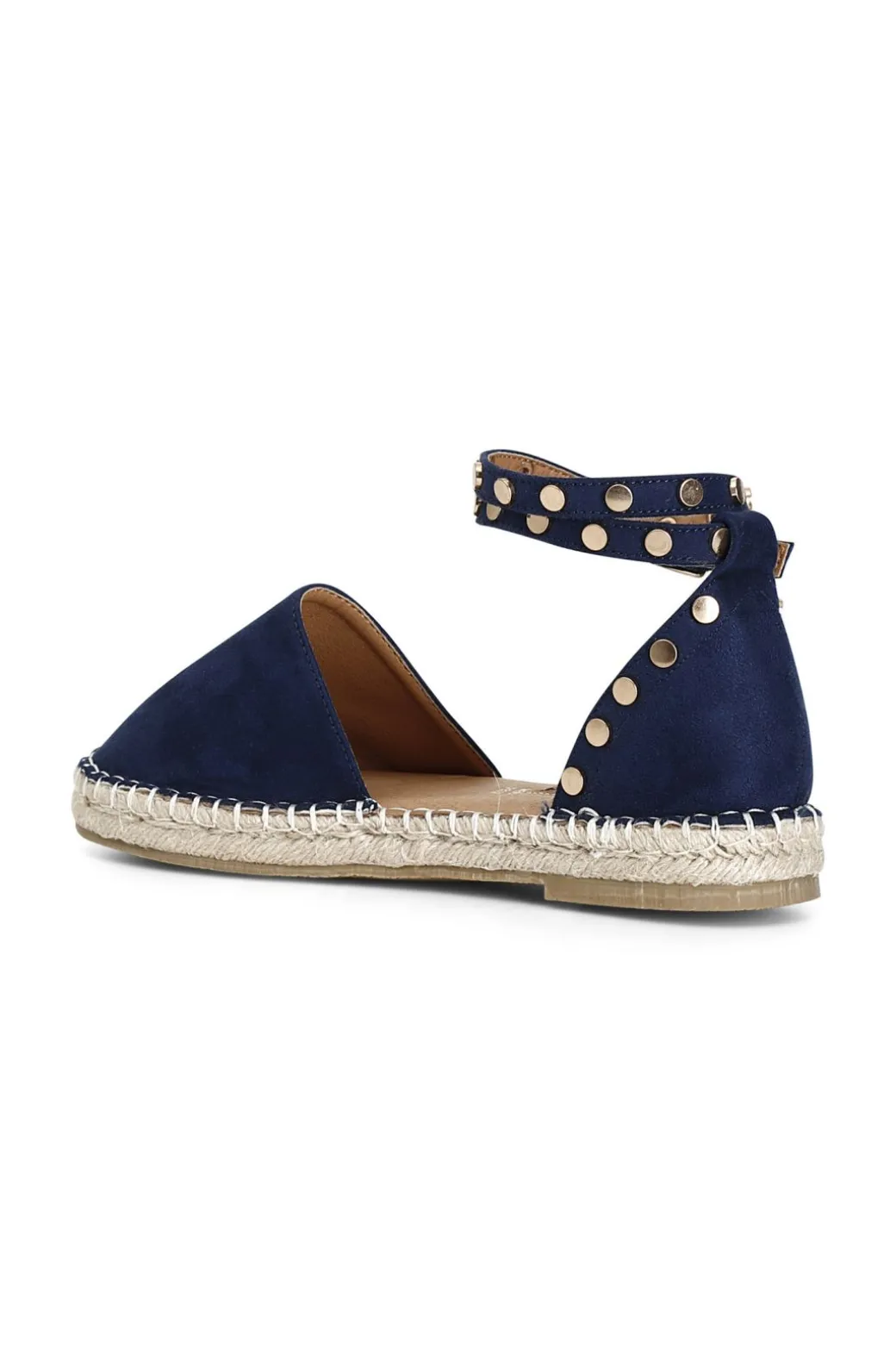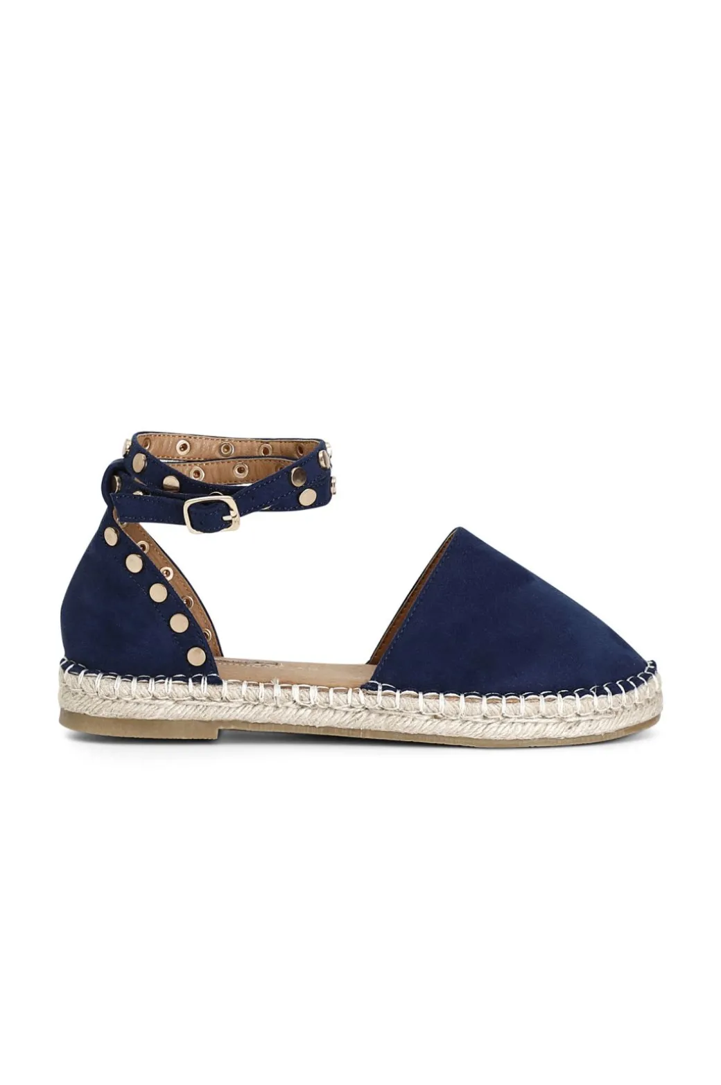 Sandali chiusi sul dietro e con cinturino alla caviglia in tessuto con borchie su fondo corda.