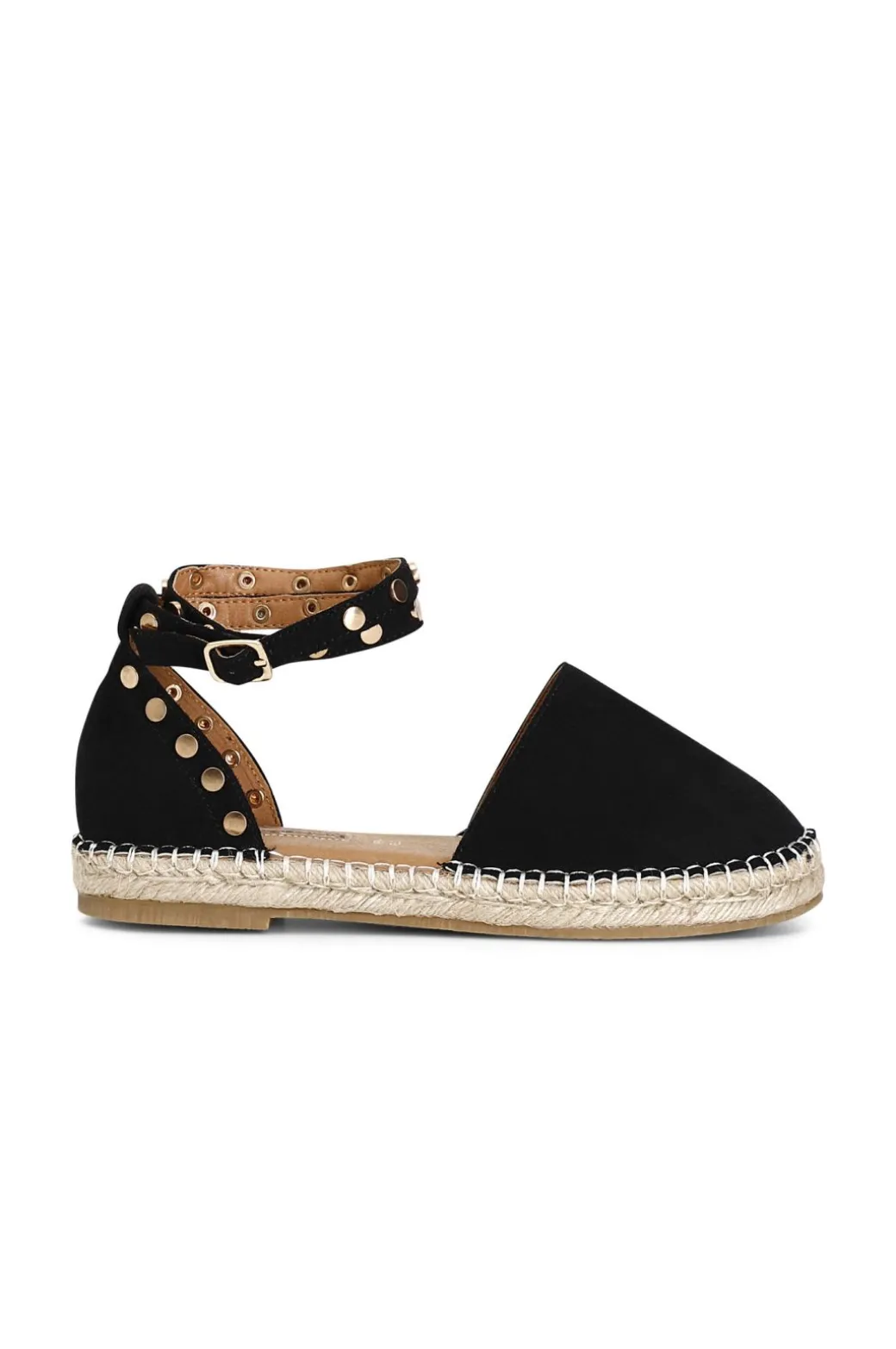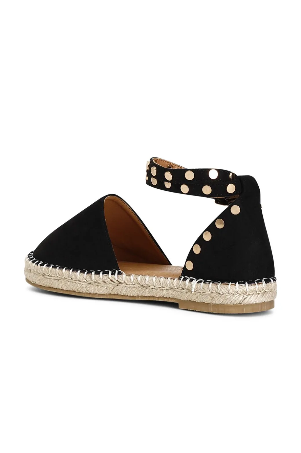 Sandali chiusi sul dietro e con cinturino alla caviglia in tessuto con borchie su fondo corda.