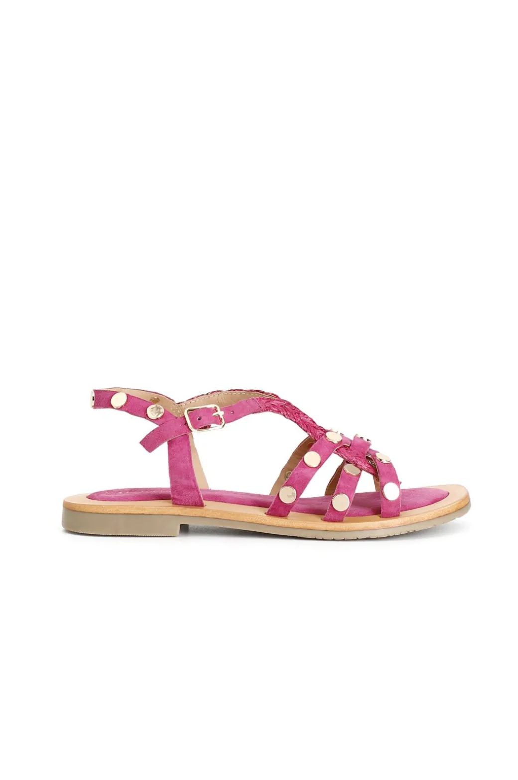 Sandali in pelle scamosciata e rafia intrecciata. borchie decorative completano l’insieme conferendo al sandalo un gusto boho chic.
