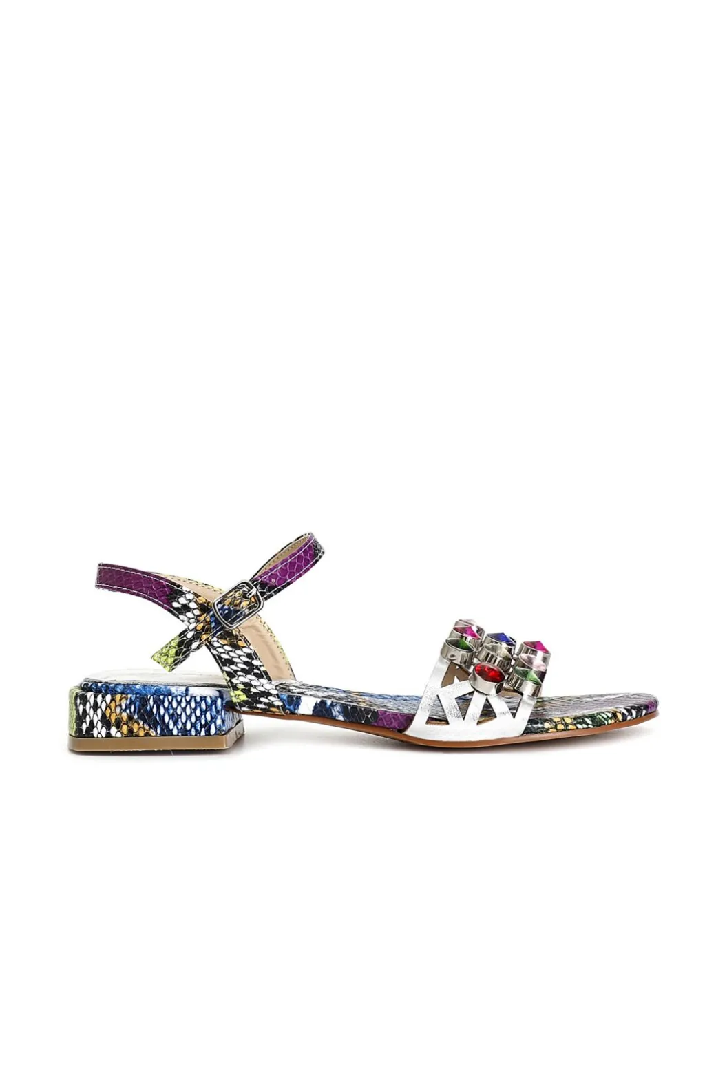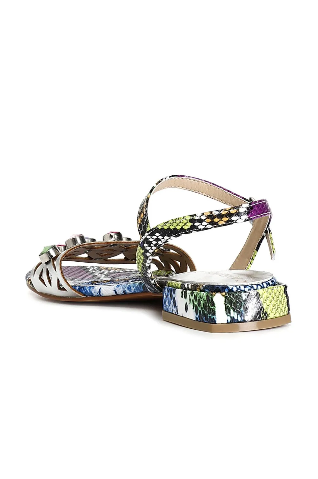 Sandali fustellati con strass colorati effetto lizard. comodo soletto imbottito per una calzata morbida. tacco alto 20mm. comodi da indossare e facili da abbinare.