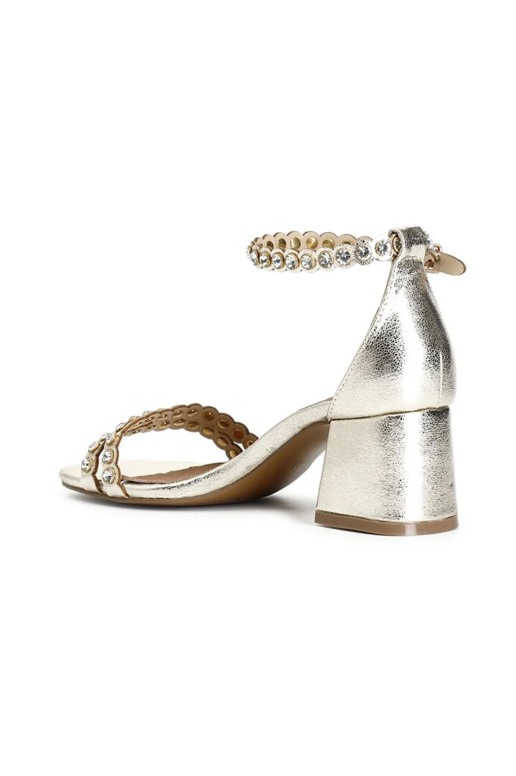 Sandali effetto metallizzato con strass. toppone sul retro. tacco medio. cinturino e fibbia regolabile alla caviglia.