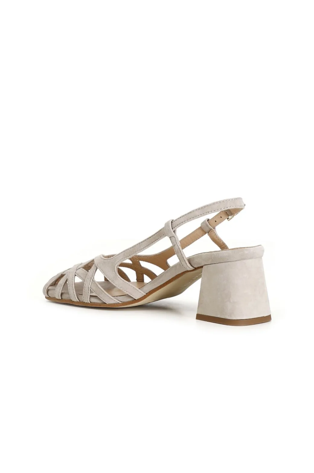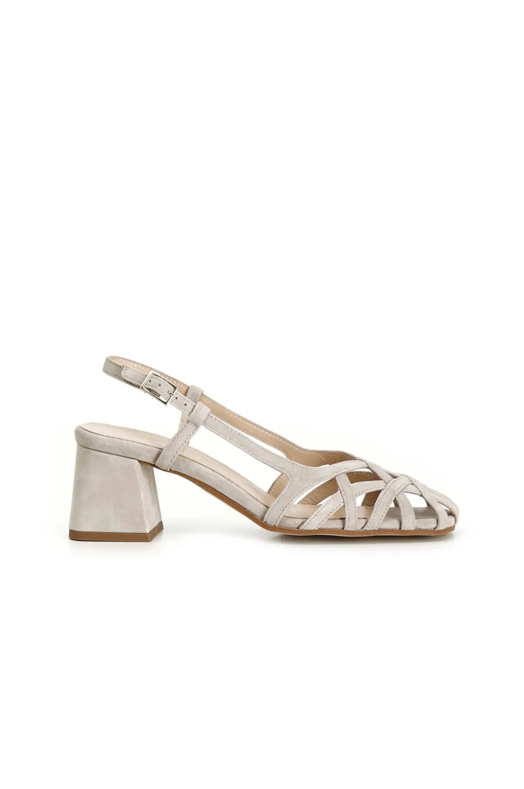 Scarpe in suede realizzate in camoscio con gabbia asimmetrica intrecciata. tacco da 5 cm fasciato con lo stesso pellame