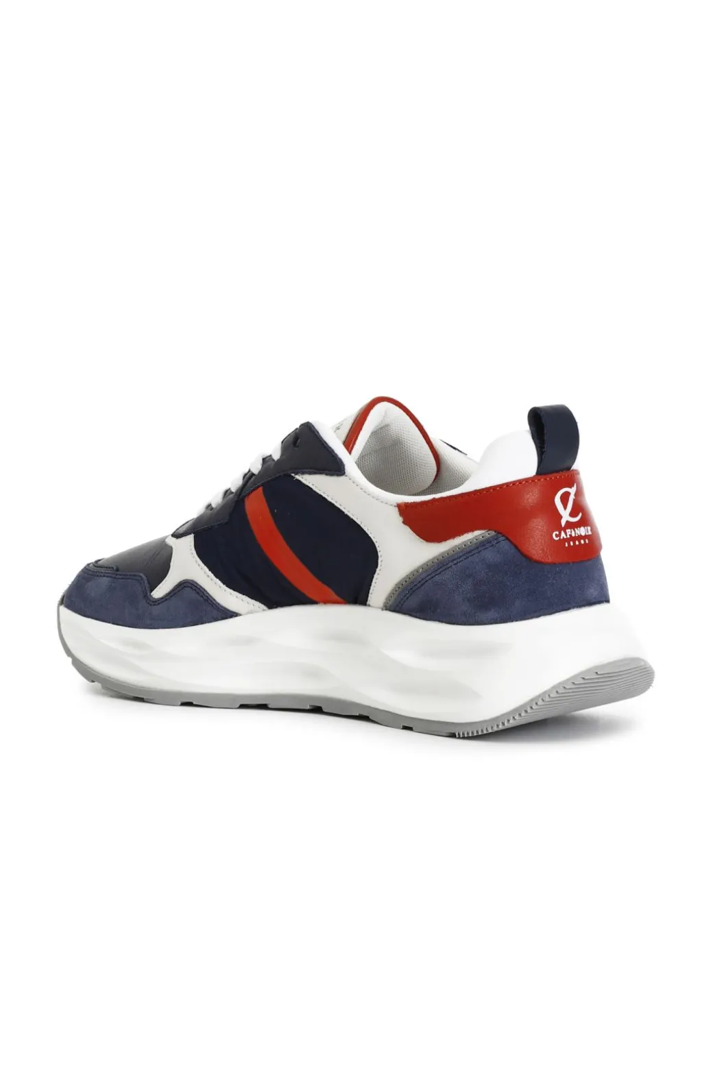 Scarpe running uomo multicolor in pelle e tessuto con nuova suola caratterizzata da un gioco di scavature che rendono la calzatura unica nel suo genere.