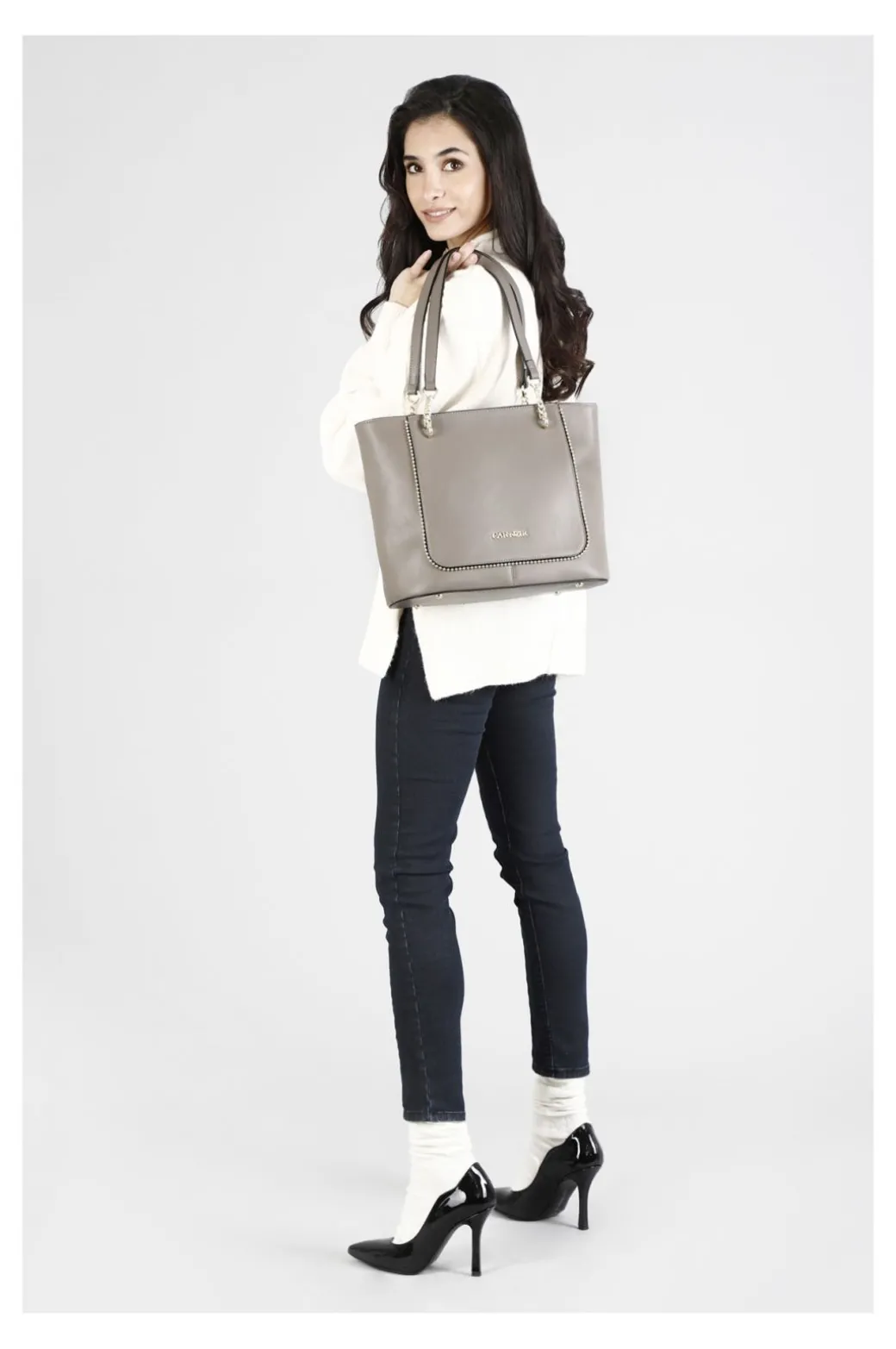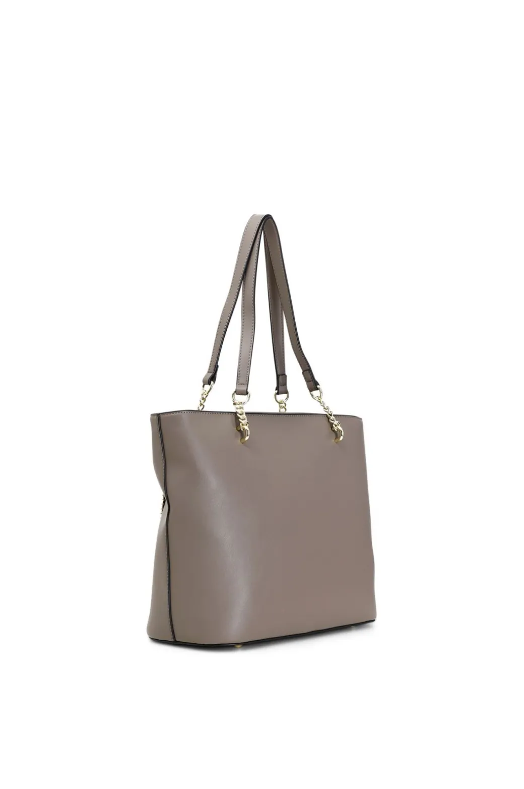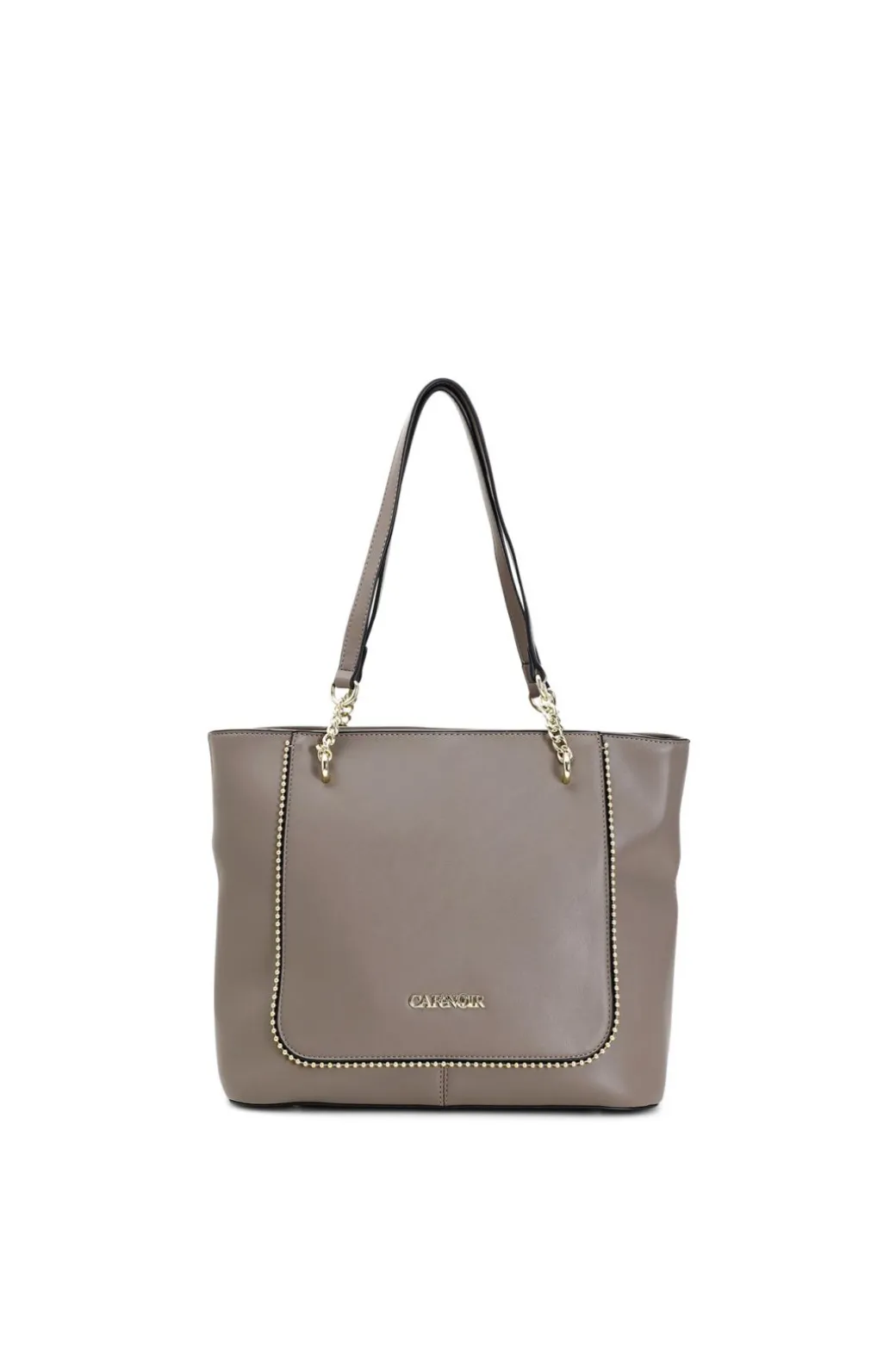 Shopping bag semirigida impreziosita da una catena di microballs che decora il quadrante anteriore